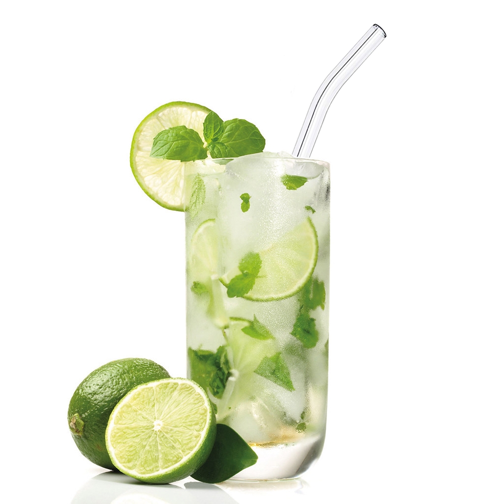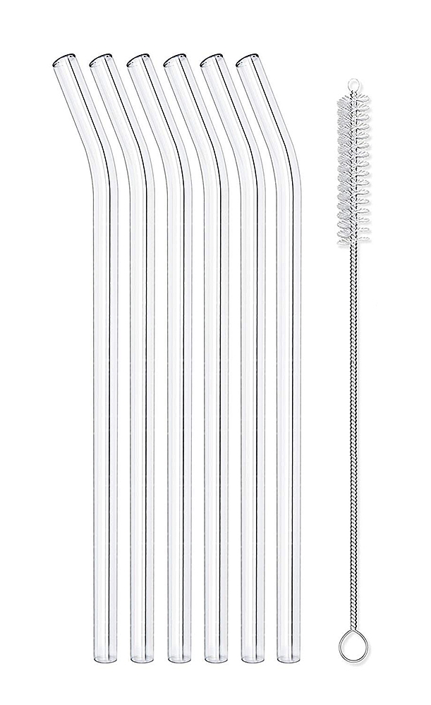Lot de six pailles coudées en verre borosilicate n'absorbant pas la chaleur. Ecologiques et réutilisables, elles n'apportent ni goût ni odeur, passent au lave-vaisselle, sont livrées avec un goupillon de nettoyage intérieur et sont garanties 5 ans.