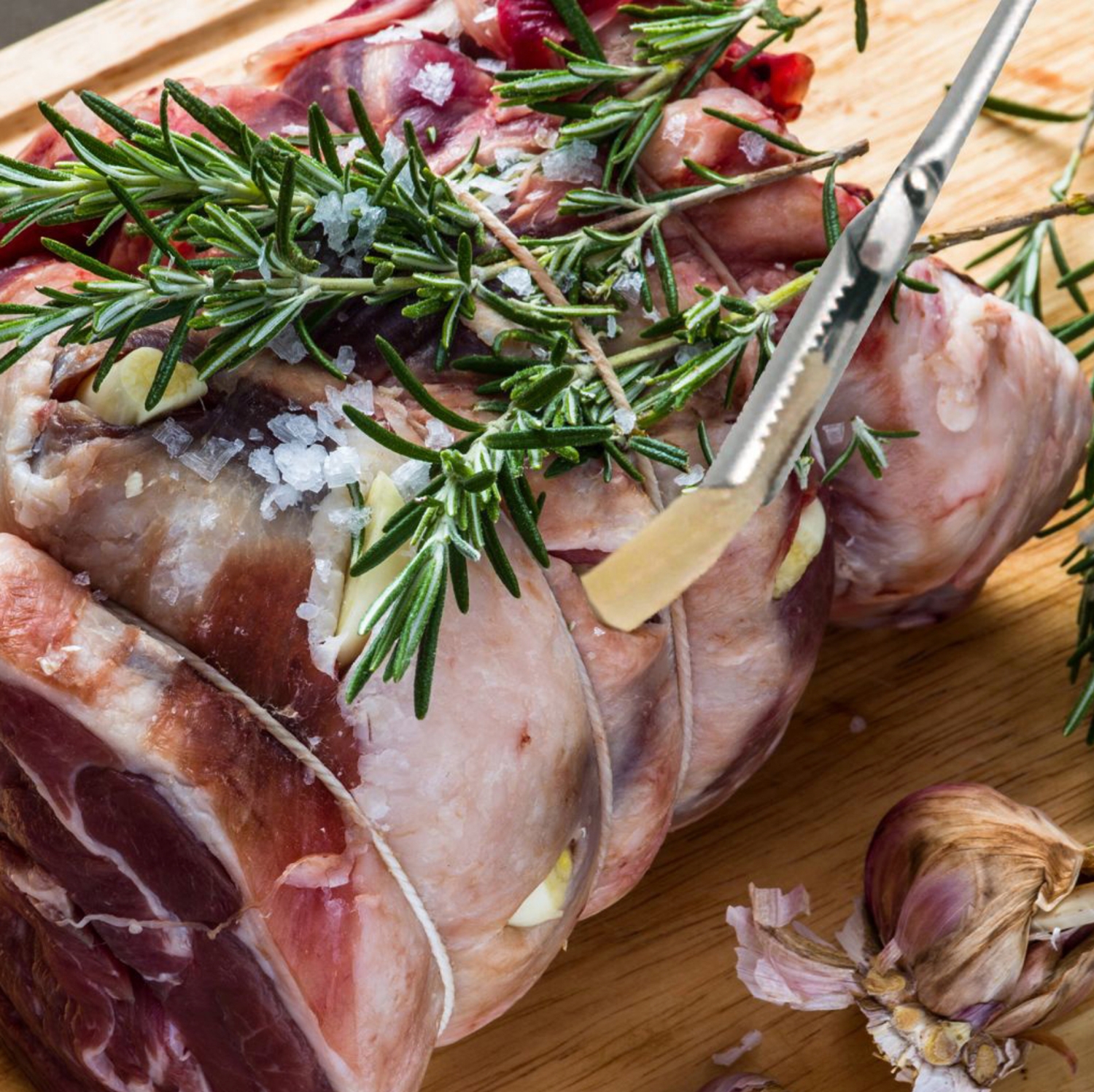 Votre aiguille à larder est dotée d'une extrémité pointue pour piquer et d'une extrémité en forme de pince pour bloquer votre bande de lard.