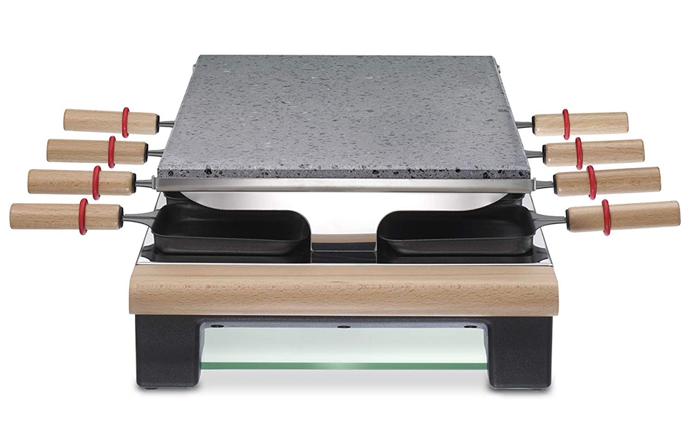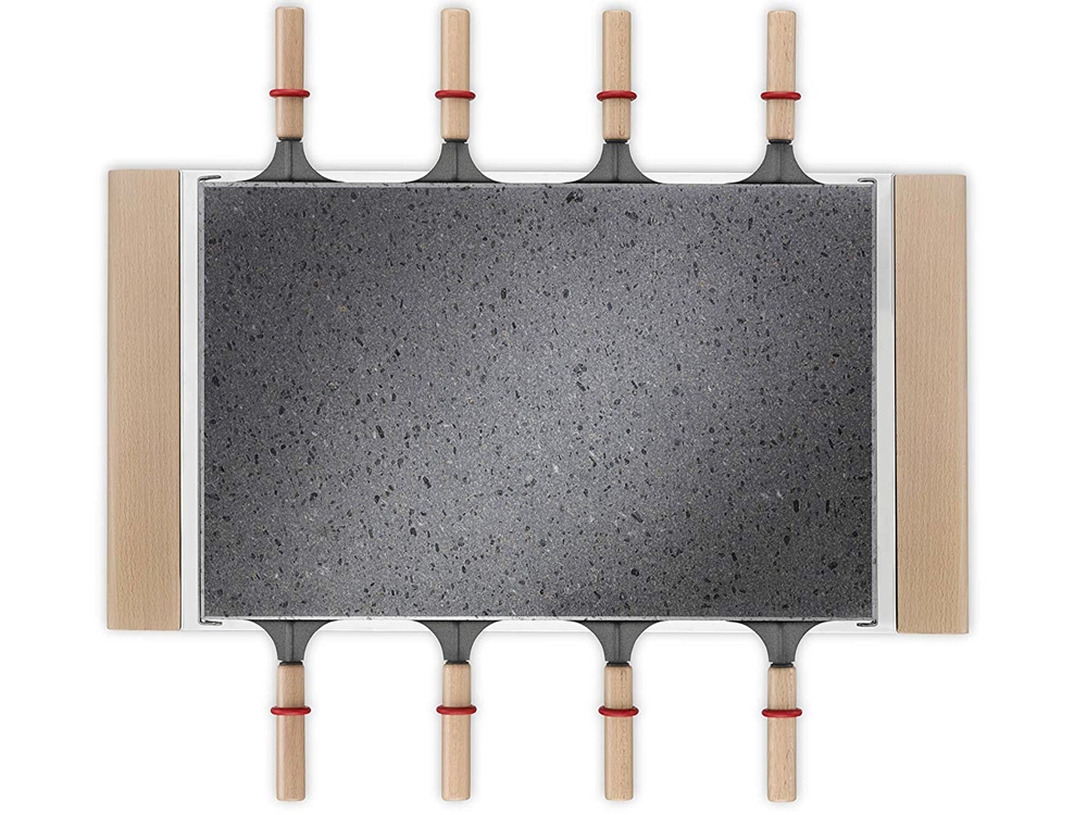 L'appareil à raclette et pierre à griller LAGRANGE est équipé d'un astucieux plateau permettant de remiser les poêlons pour suspendre la cuisson tout en les maintenant au chaud.
