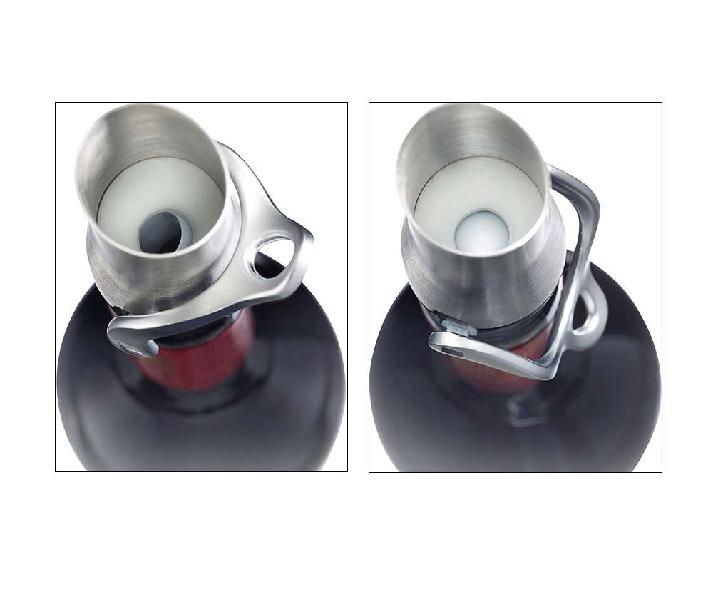 Bec verseur avec mécanisme de fermeture pour verser sans gouttes. Le bouchon lamellé épouse parfaitement le col de la bouteille. Le mécanisme de fermeture intérieur est actionné en abaissant le levier.