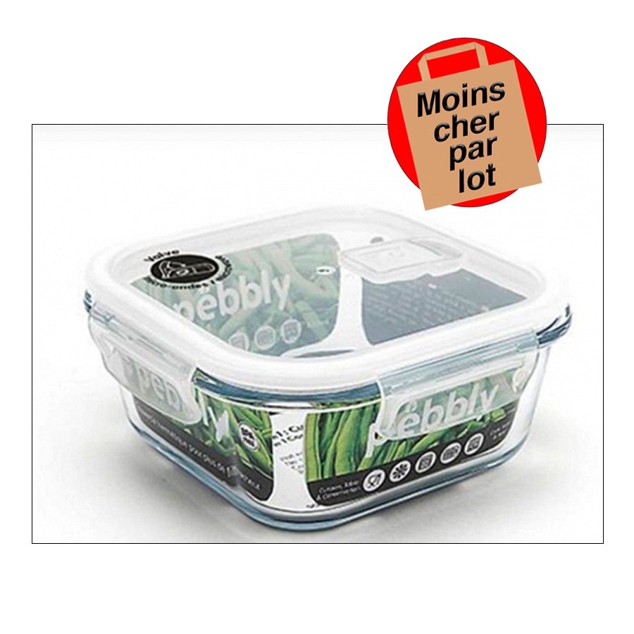 Boîtes carrées en verre borosilicate possédant un couvercle fermant hermétiquement avec joint en silicone alimentaire et passant au micro-ondes grâce à un clapet spécialement adapté à cet usage. Ces boîtes permettent un usage de cuisson et de conservation.