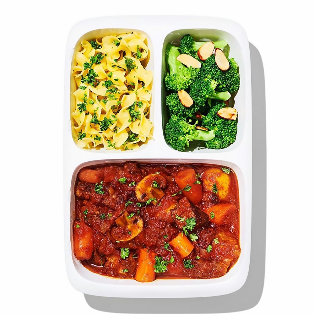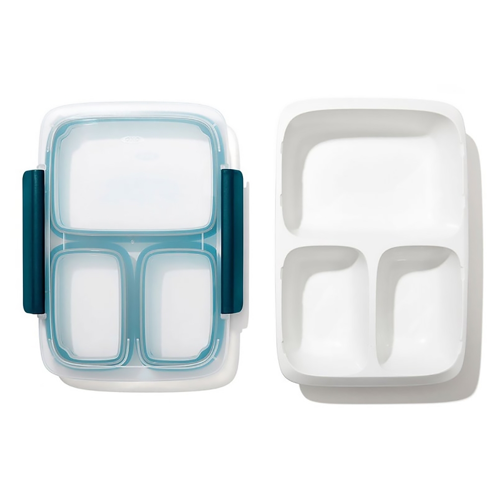 La Boîte repas 3 compartiments Oxo Prep & Go Oxo permet d'emporter 3 préparations distinctes sans que ces dernières ne se mélangent. La fermeture de la boîte est hermétique et chaque compartiment indépendant possède son propre joint assurant une étanchéité parfaite. Elle est compatible micro-ondes, congélateur et lave-vaisselle et est exempte de BPA.