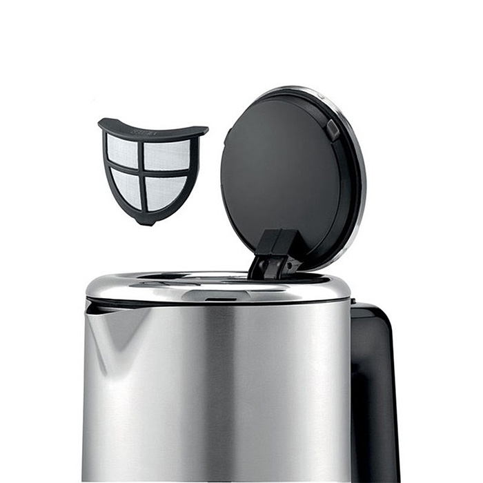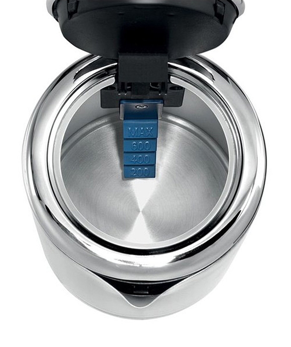 Bouilloire électrique en acier inoxydable et plastique fonctionnant sur socle amovible possédant un enrouleur de câble. Cette article est pourvu d'une protection contre la marche à sec et la surchauffe ainsi qu'un arrêt automatique en fin de cycle et un couvercle verrouillable. Le niveau d'eau est visible.