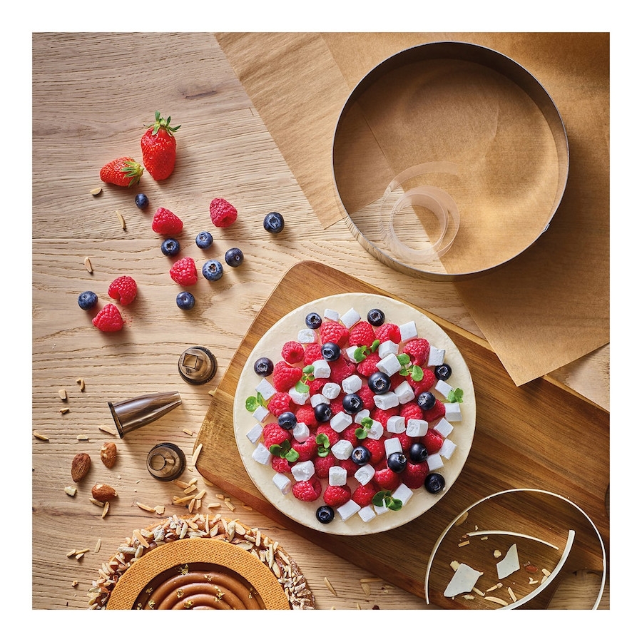 - Cette box contient : un cercle à pâtisserie en acier inoxydable de 20 cm, un ruban pâtissier pour chemiser les cercles, une poche extra souple réutilisable 34 cm de longueur, un assortiement exclusif de 6 douilles sur support (2 unies de 11 et 15 mm de diamètre, une St Honoré de 9mm, 2 cannelées PF10/PF14), un carré de 10 mm et un rouleau de papier cuisson antiadhérent de 1,38cmx8m.