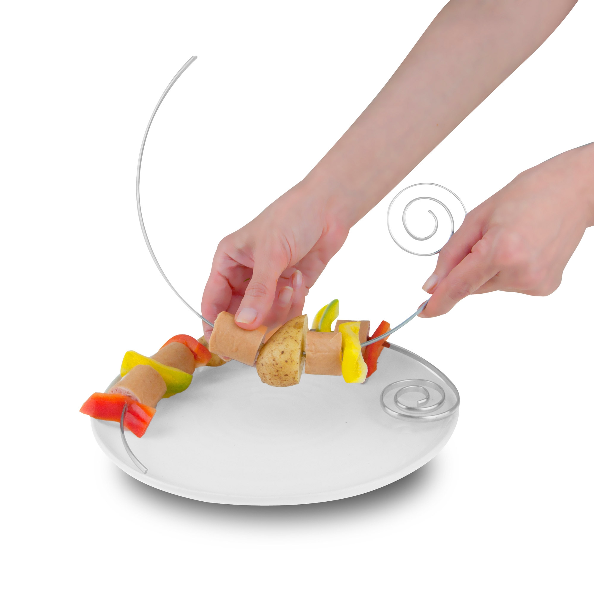 Les brochettes Genietti sont parfaitement adaptées pour une cuisson sur un barbecue rond et se glissent facilement dans une assiette.