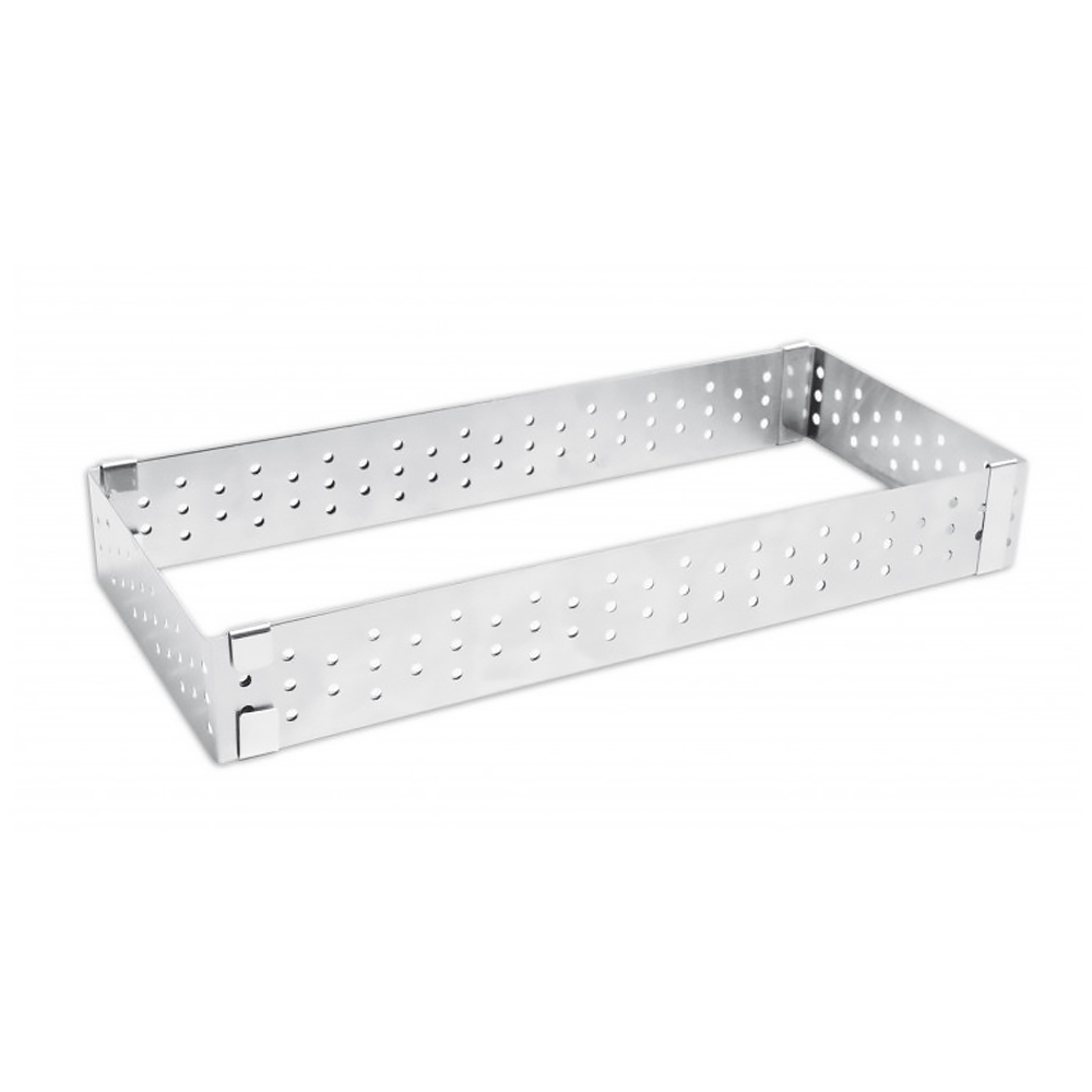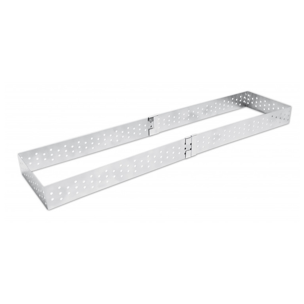 Le Cadre à Tarte Extensible & Perforé Scrapccoking est réalisé en acier inoxydable. D'une hauteur de 3 cm et d'une largeur de 10 cm, sa longueur peut varier de 22 à 42 cm. Ses bords perforés permettent une cuisson homogène et un démoulage très facile. Il est compatible four et lave-vaisselle.