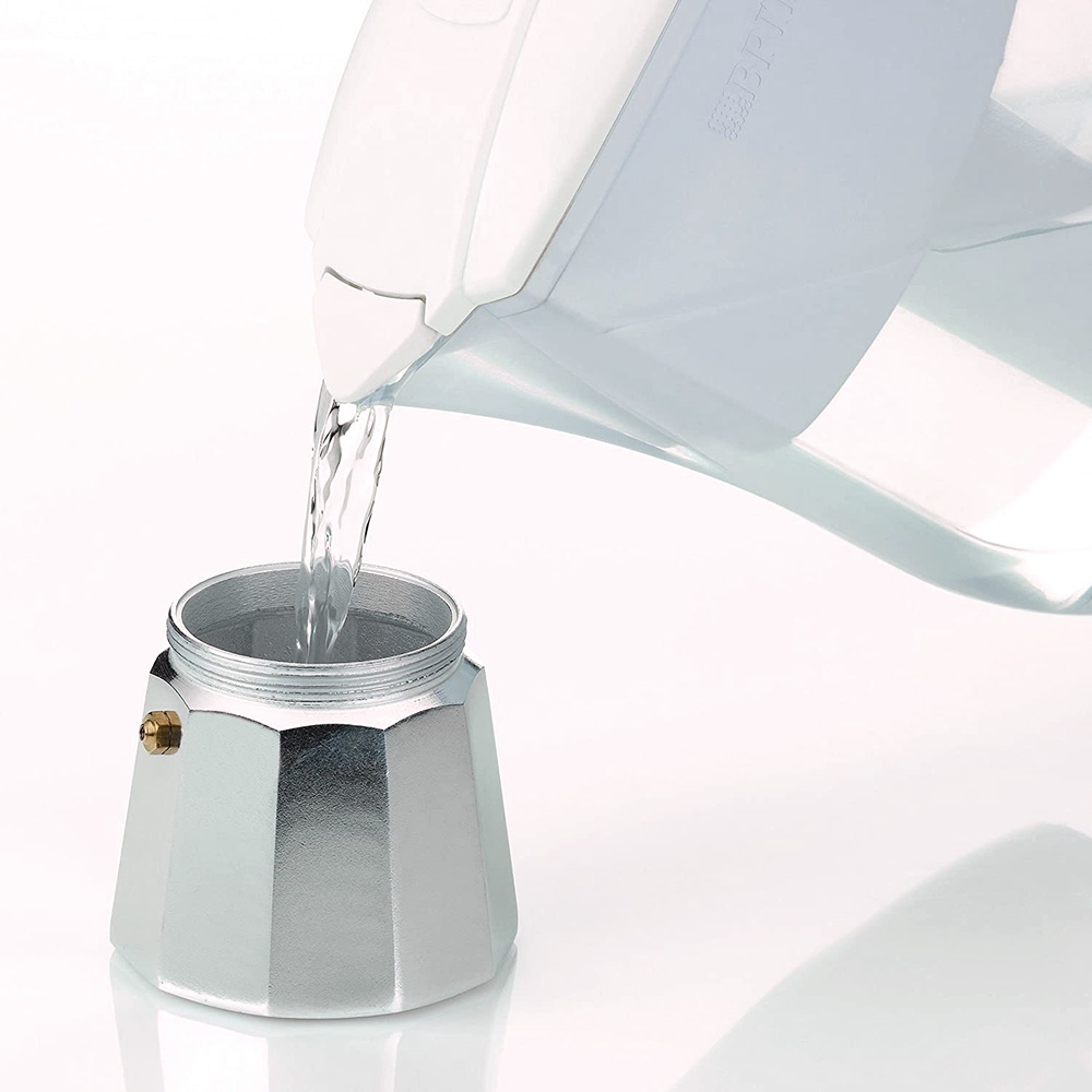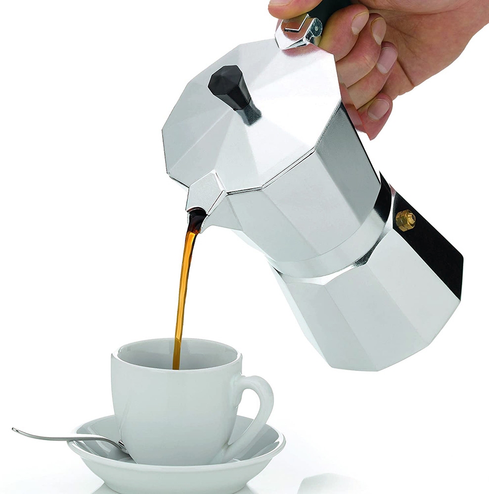 Principe de la cafetière italienne. La cafetière italienne est composée de 2 parties séparées par un porte filtre contenant une dose de café moulu. En plaçant de l'eau dans la partie inférieure, celle-ci en chauffant remonte sous forme de vapeur sous pression en traversant le porte filtre et se mélange au café moulu. Le café une fois constitué et passé dans la cheminée centrale retombe alors dans la partie supérieure.Votre café expresso est ainsi prêt en quelques minutes seulement. La cafetière italienne sert en même temps de verseuse.