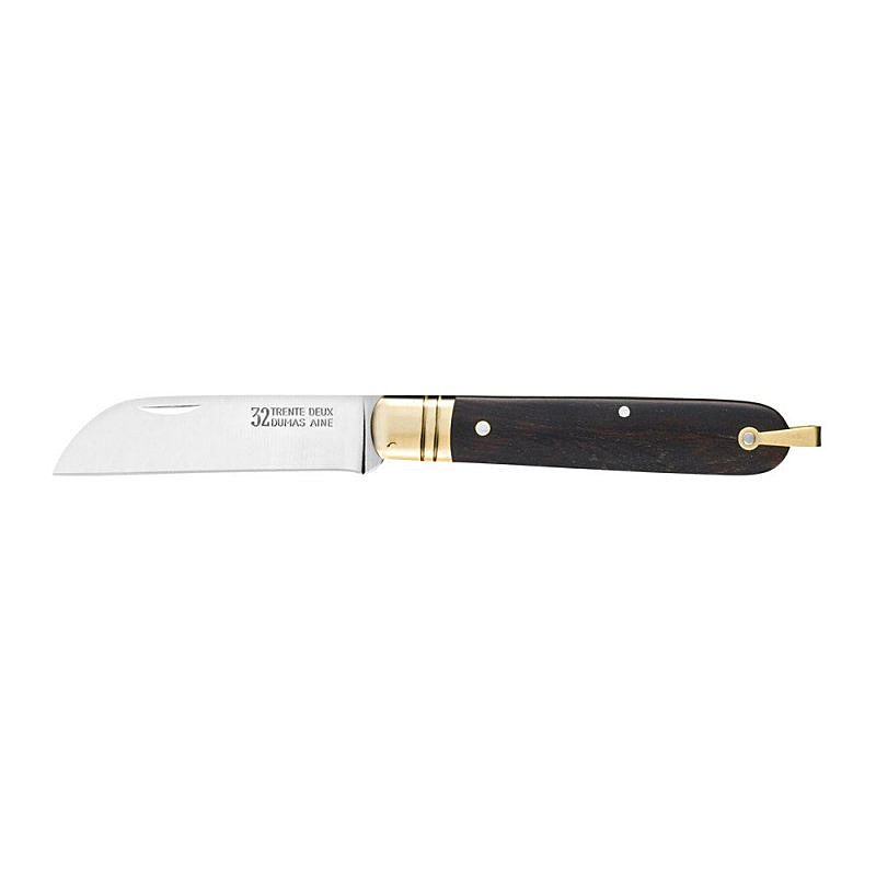 Le couteau "Le p'tit 32 de mon grand-père" est la réédition du célèbre couteau de poche Thiers de 1908. Réalisé en acier, il possède une lame pliante avec mitre et bélière en laiton ainsi qu'un manche en bois Bubinga riveté. Un anneau en bout de manche permet d'y fixer une chainette.