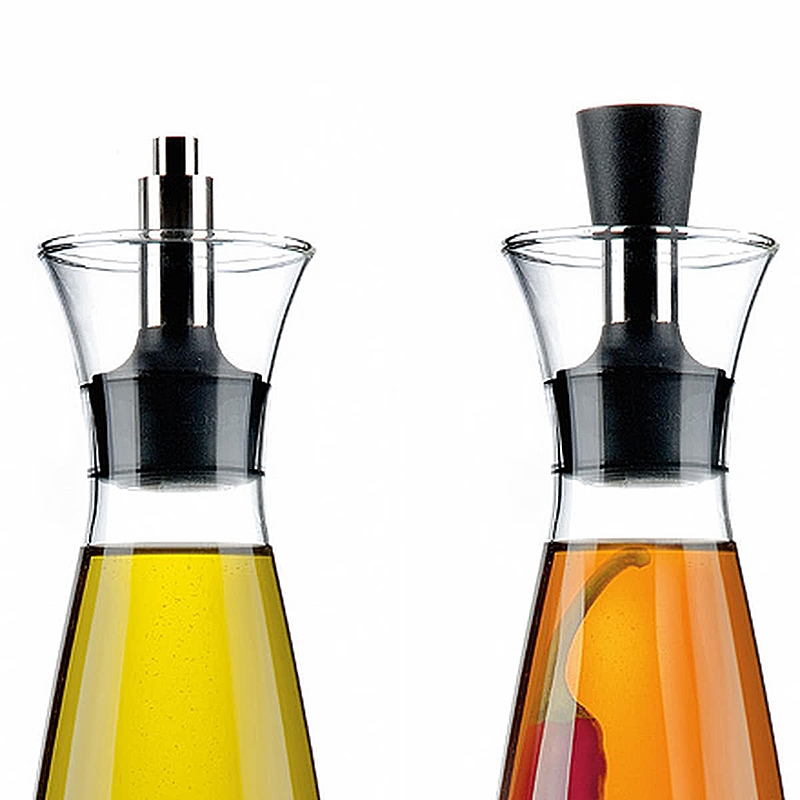 Elégante carafe en verre avec bouchon stop-goutte en acier inoxydable et silicone pour recevoir et conserver vos huiles et vinaigres et préserver leur arômes et saveurs.