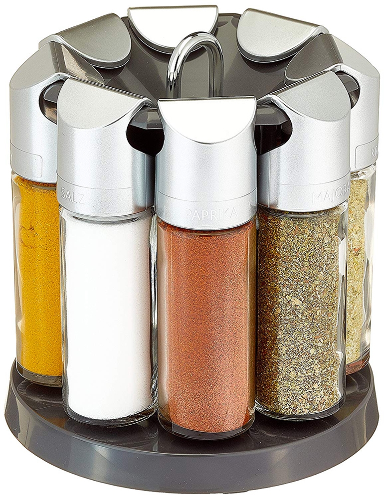 Ce carrousel à épices vous permettra de conserver vos condiments les plus courants toujours à portée de main, dans votre cuisine comme à table ! Présenté sur un support pivotant ce bel objet allie l'utile et l'agréable.