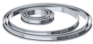Inox 18/10. Bord roulé. Perforations de 1 mm tout autour du cercle. Hauteur: 2 cm. Va au lave vaisselle. Produit professionnel. Fabrication française