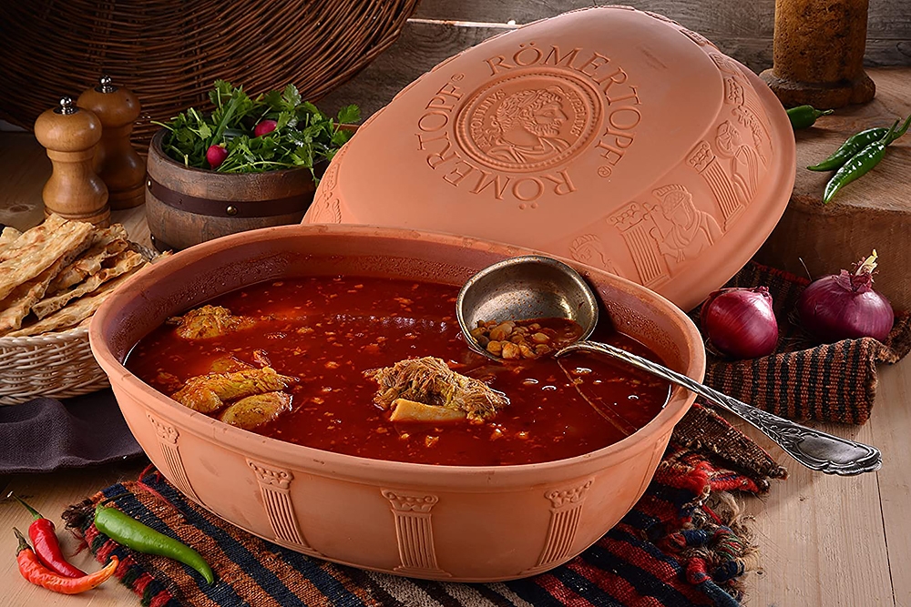 Terre d'argile naturelle. Dimensions : 42,5 x 32,5 x 21,5 cm. Idéale pour 8 - 10 personnes. 8 kg de viande ou de volaille. Va au four et micro-ondes. Lavage à la main conseillé. Fabriquée en Allemagne. Livrée avec mode d'emploi et recettes.