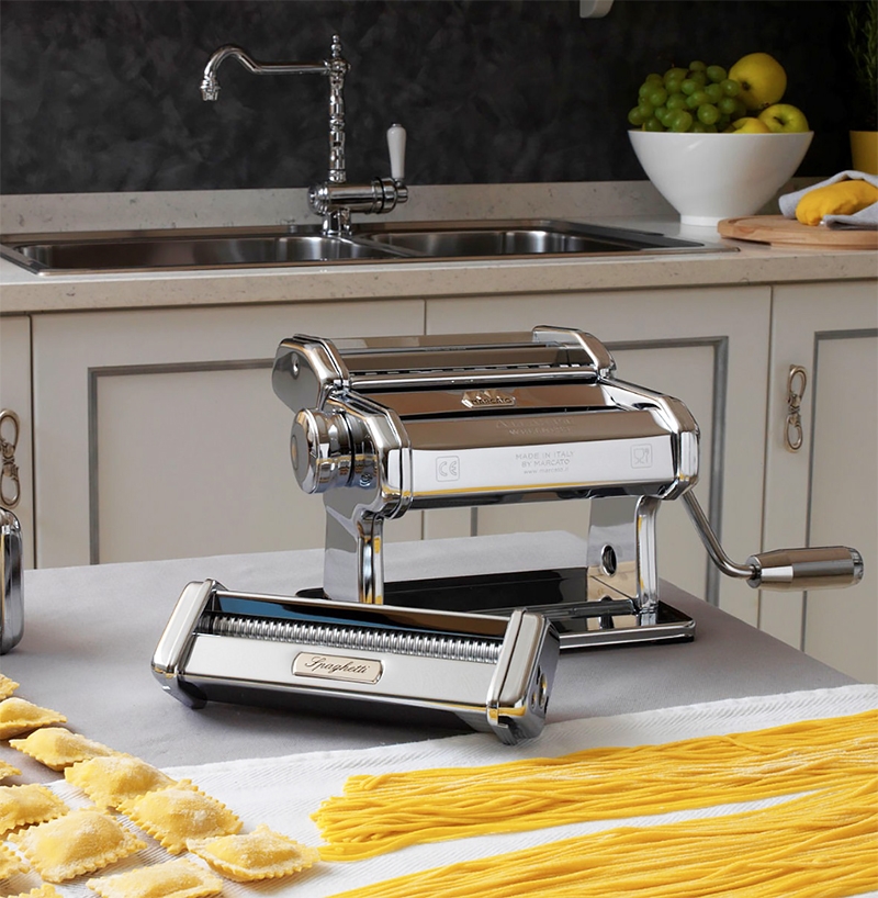Le Coffret Machine à pâtes Atlas 150 Pasta Set Marcato est idéal pour les amateurs de pâtes fraîches. Le kit Pasta Set comprend une machine Atlas 150 et 2 accessoires permettant de préparer 5 types de pâtes différentes. Le kit est entièrement réalisé en acier chromé de haute qualité. Les rouleaux sont en alliage d'aluminium anodisé, une caractéristique essentielle des produits Marcato, et les peignes et racleutrs sont en résine polymère afin d'éviter le libération de poussière nocives sur les pâtes et de garantir un produit 100% sain et naturel.