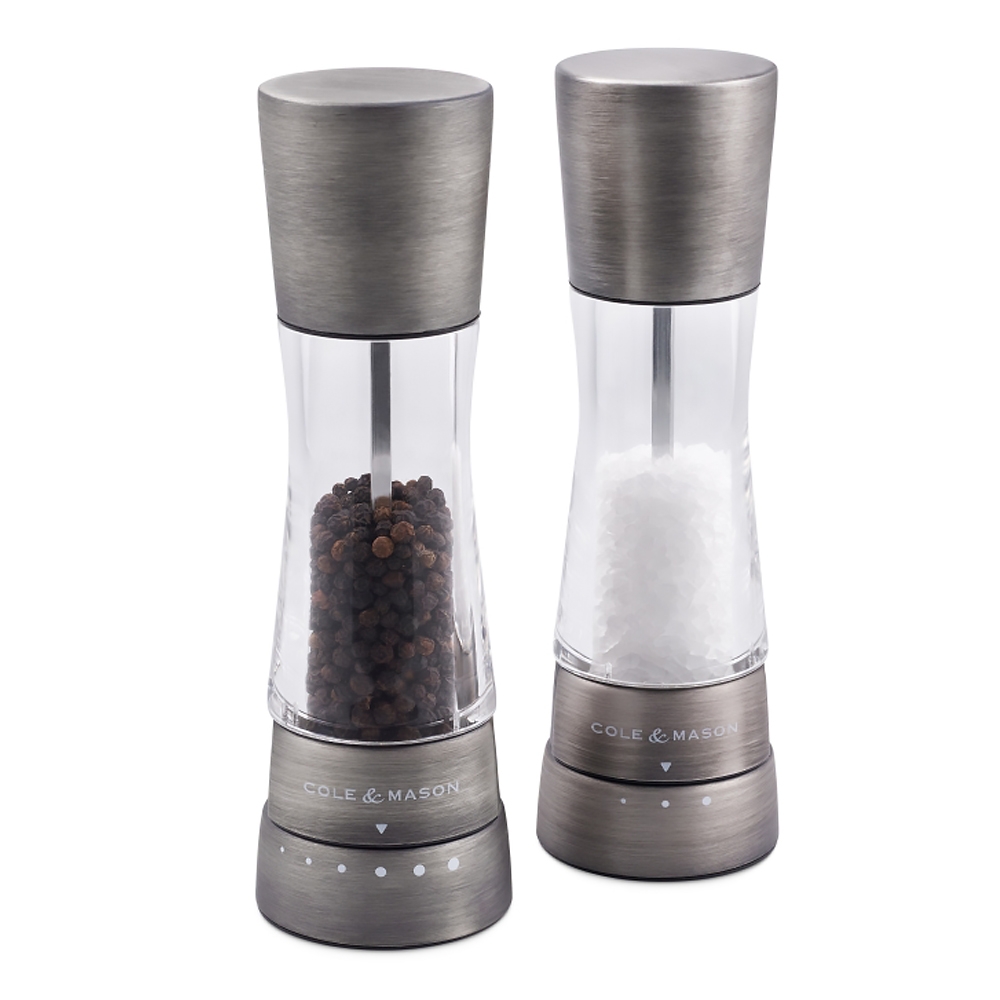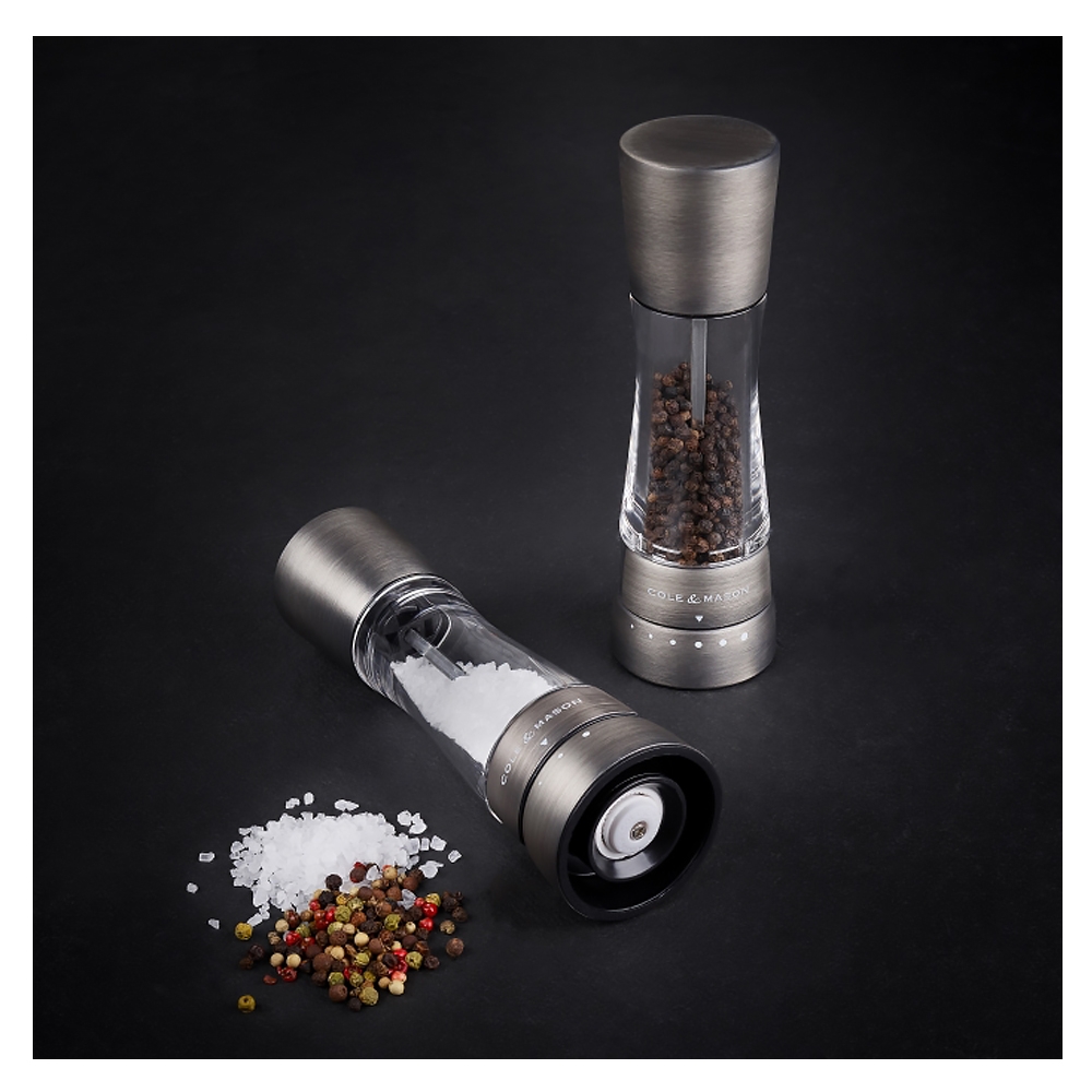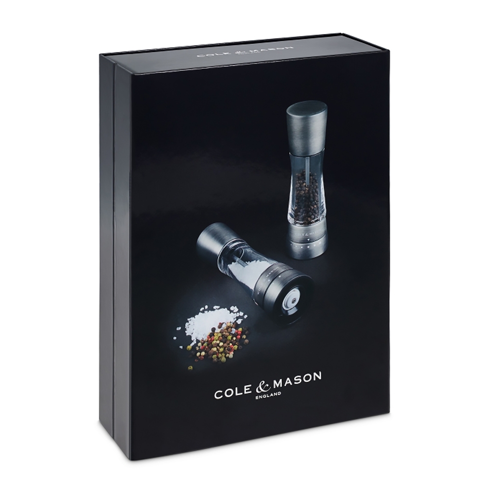 Coffret Cole & Mason comprenant un moulin à poivre avec mécanisme en acier carbone et un moulin à sel avec mécanisme en céramique diamantée. Ces moulins sont réalisés en acier inoxydable et acrylique, ils sont garantis 2 ans (mécanismes garantis à vie) et possèdent 6 réglages de moutures pour le poivres et 3 pour le sel.