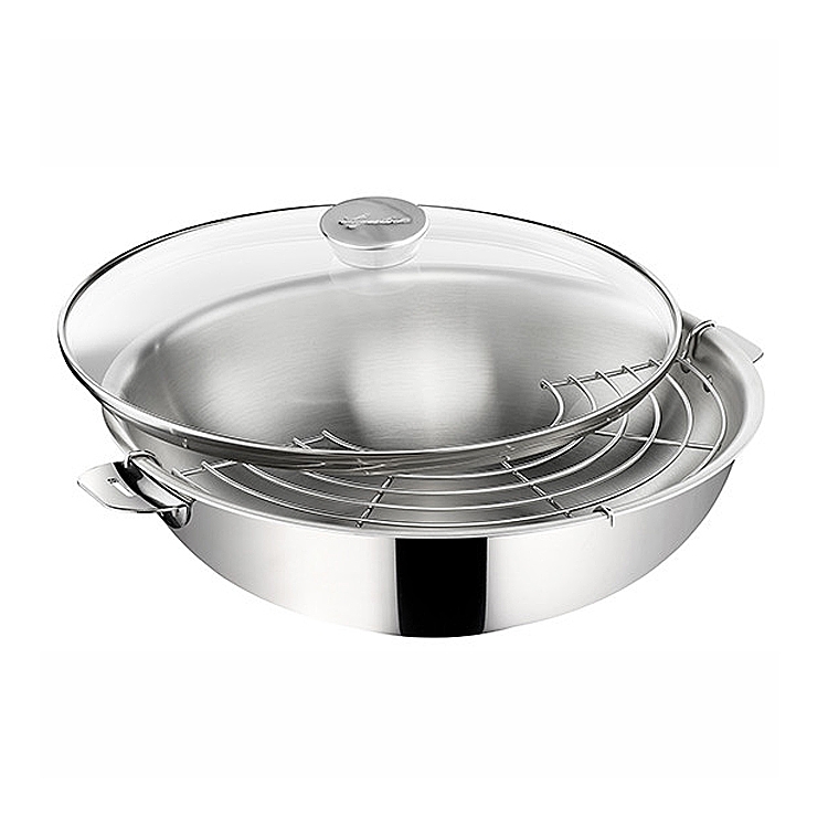 Trou d'évacuation pour la vapeur. Couvercle en verre cerlé avec baguette inox. Poignée inox. Va au four jusqu'à 210°c et au lave vaisselle.