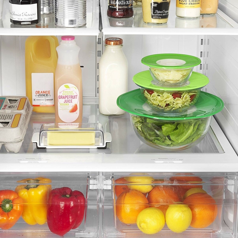 Couvercle en silicone alimentaire réutilisable et empilable à fermeture hermétique instantanée par aspiration. Il s'adapte à toutes les boîtes en plastique, céramique, acier et verre à bords lisses.