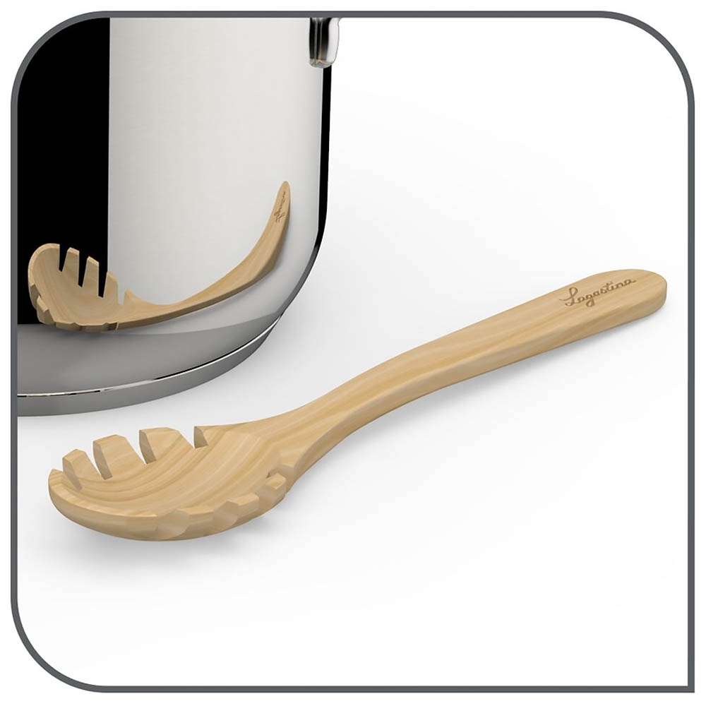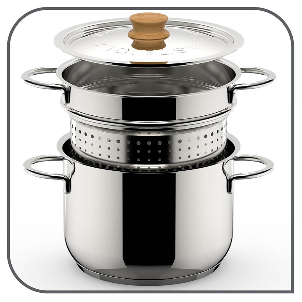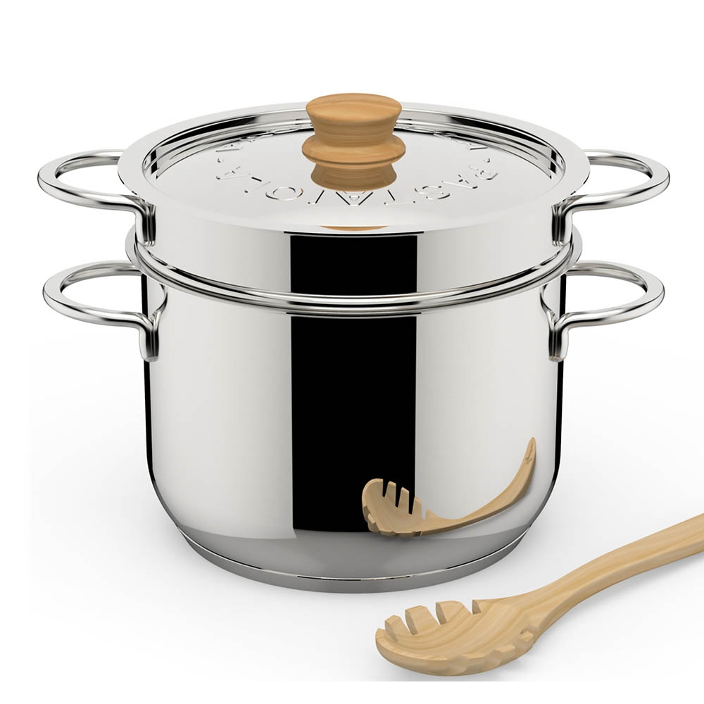 Le Cuit-Pâtes Dedica Lagostina est réalisé en Italie en Acier inoxydable de grande qualité. Il se composre d'une cuve de plus de 5 litres, d'une passoire intégrée et d'un couvercle orné d'un magnifique bouton en bois de cerisier. Il est en outre livré avec une cuillère à spaghettis en bois. Le panier est doté de trous de différents diamètres qui par leur position permettent un égouttage optimal.
