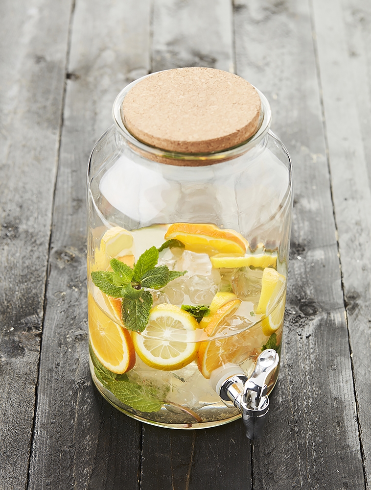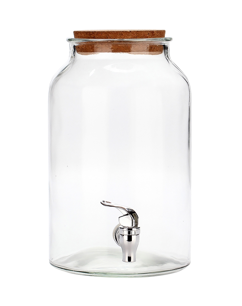 Distributeur de boissons chaudes ou fraîches en verre d'une contenance de 5,6 litres avec robinet en matière synthétique et bouchon en liège permettant à l'air de passer pour optimiser l'écoulement de la boisson. Parfait pour présenter toutes sortes de coktails.