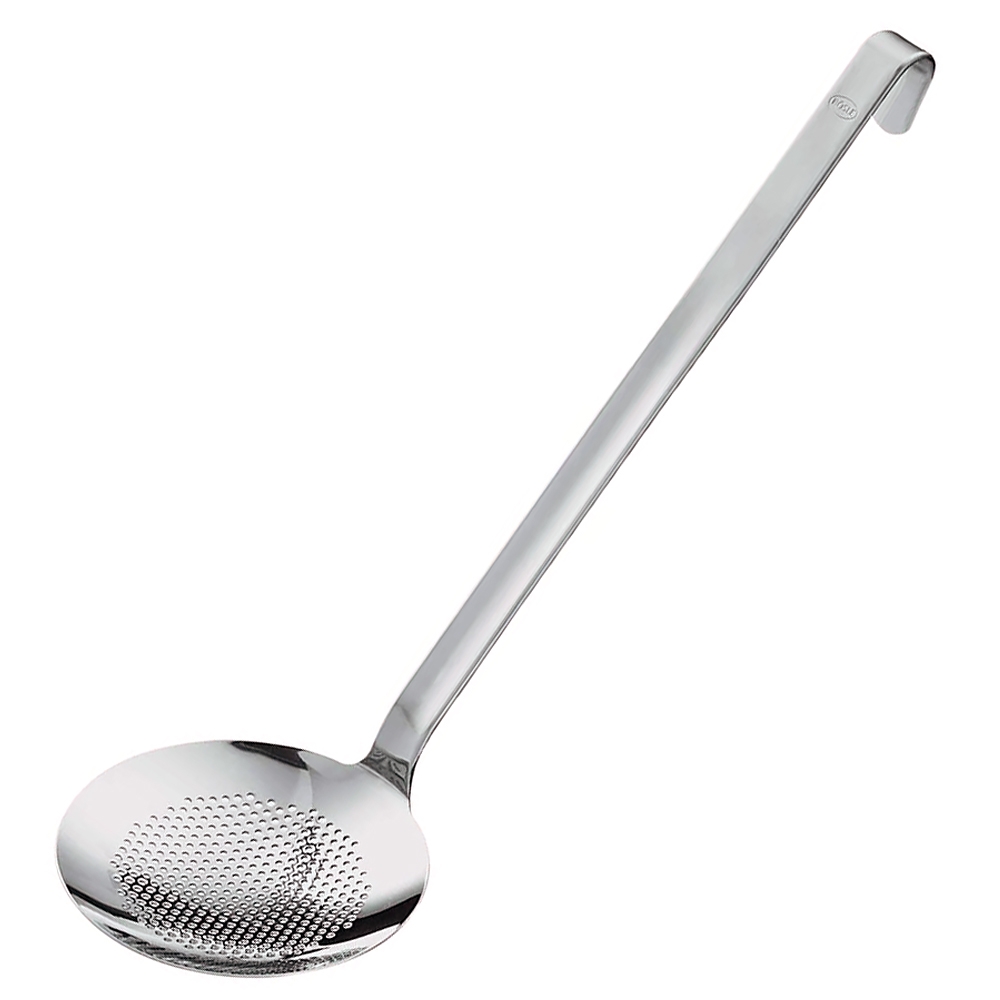 Inox 18/10. Longueur 33 cm. ø 11 cm. Diamètre perforations 2 mm. Bord haut anti-glissement. Manche 3 mm d'épaisseur. Crochet arrondi pour suspendre. Va au lave vaisselle. Garantie à vie.