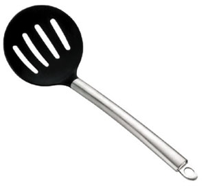 Manche ergonomique inox. Extrémité silicone résistante aux hautes températures. Trou pour suspension. Va au lave vaisselle.