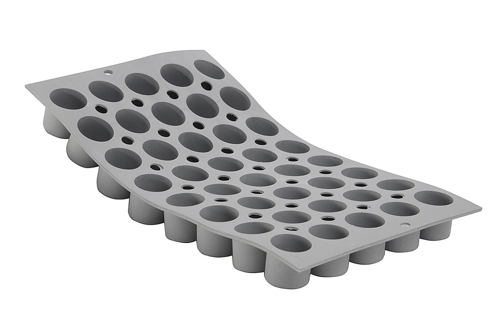 Mousse de silicone alimentaire. Antiadhésif. Va au four, micro-ondes et congélateur. Résiste aux températures de -70°c à + 300°c. Va au lave vaisselle. Plaque de dimensions : 300 x 176 mm pour la réalisation de 40 empreintes de mini-cylindres de diamètre de 27,5 mm et d'une contenance de 1,4 cl.