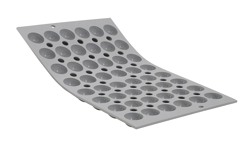 Mousse de silicone alimentaire. Antiadhésif. Va au four, micro-ondes et congélateur. Résiste aux températures de -70°c à + 300°c. Va au lave vaisselle. Plaque de dimensions : 300 x 176 mm pour la réalisation de 48 mini demi-sphère à fond plat de 25 mm de diamètre pour une contenance de 4 cl.