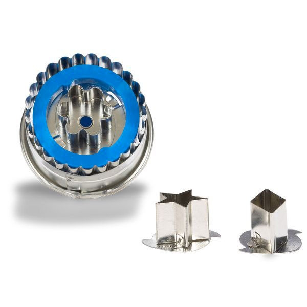 Inox. Emporte-pièce inox pour biscuits pleins ou troués avec 3 formes de découpes centrales amovibles. Format moyen 5 cm.