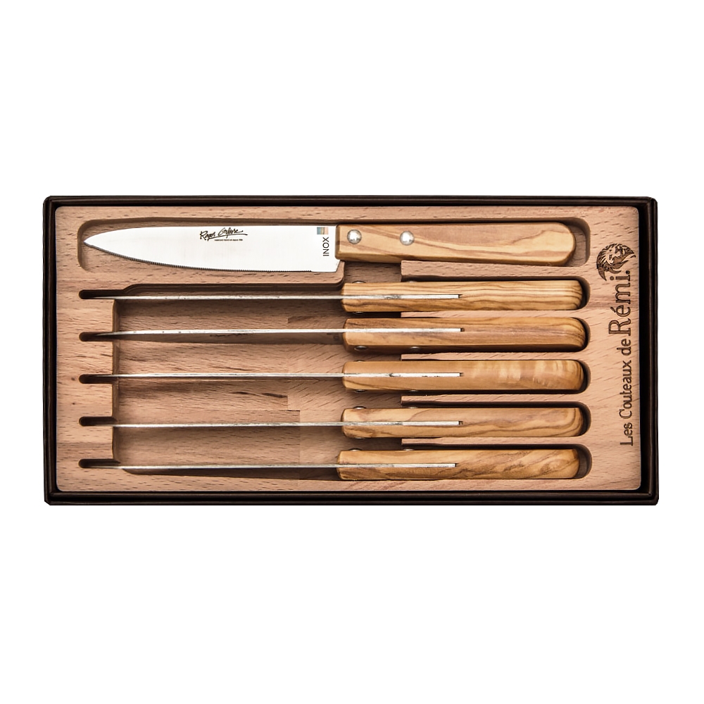 L'ensemble de 6 "Couteaux de Rémi" Roger orfèvre se compose donc de 6 couteaux à lame en acier inoxydable et manche en bois d'olivier riveté présentés dans une boîte en bois et carton. Utilisables en cuisine ou sur table, ces couteaux vous accompagneront longtemps dans vos préparations et dégustations.