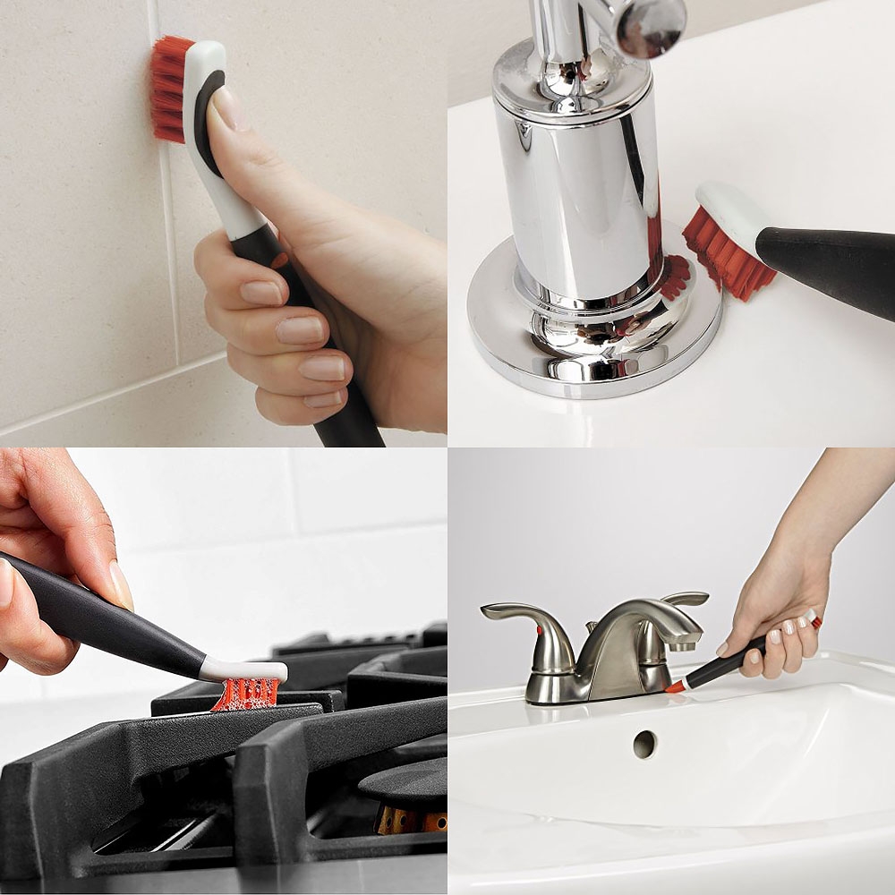 Ensemble de 2 brosses (3 outils) pour nettoyer facilement les endroits difficiles d'accès où la saleté s'accumule. Les prises en main sont souples, confortables et anti-dérapantes. La grande brosse pour le coulis, les rails de la porte de douche, le dessus de la cuisinière etc...La petite brosse pour les appareils sanitaires et autres espaces restreints. La raclette déloge la saleté accumulée dans les drains et les fentes.