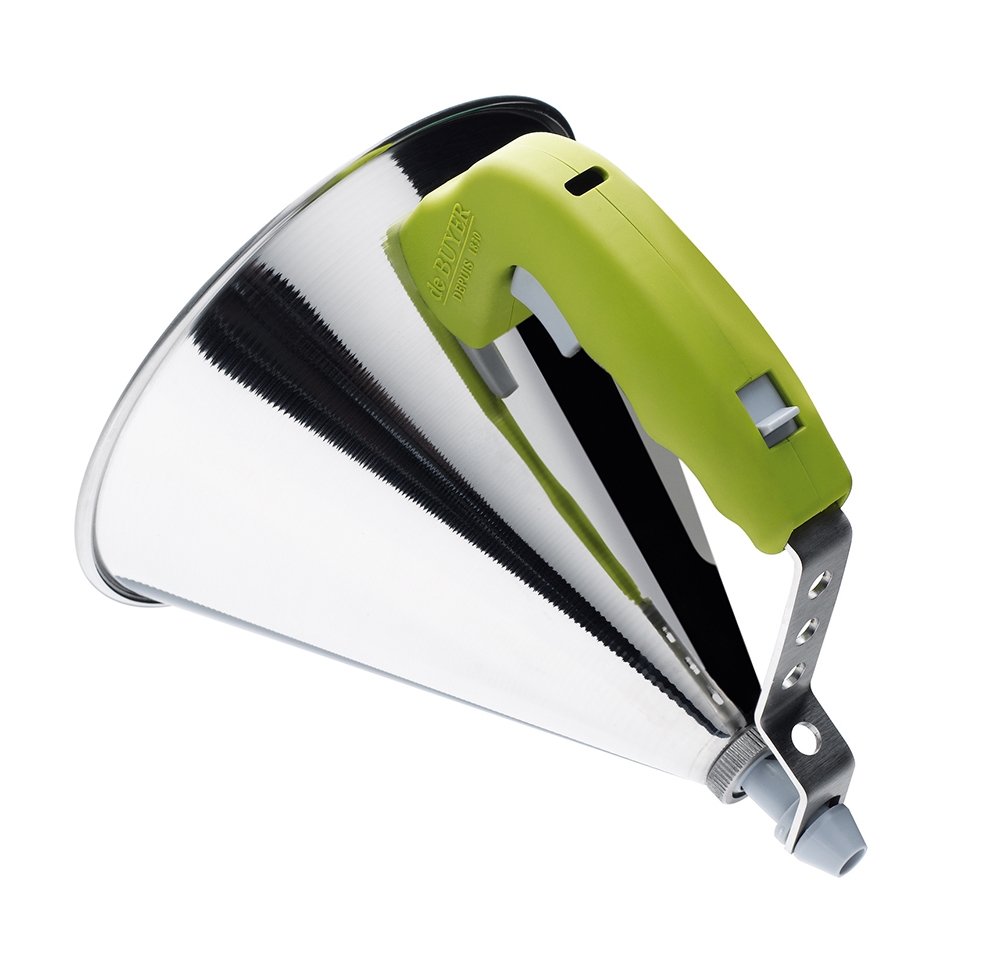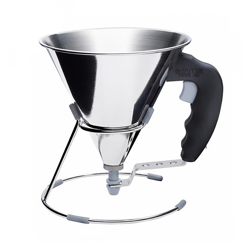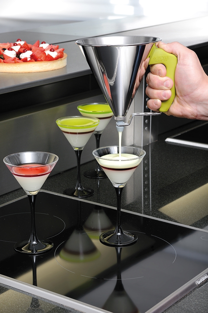 L'entonnoir à piston DE BUYER permet de décorer, remplir,verser et doser tous les ingrédients liquides. Son encombrement a été réduit au maximum tout en préservant une contenance de l'entonnoir raisonnable (0.8 L).