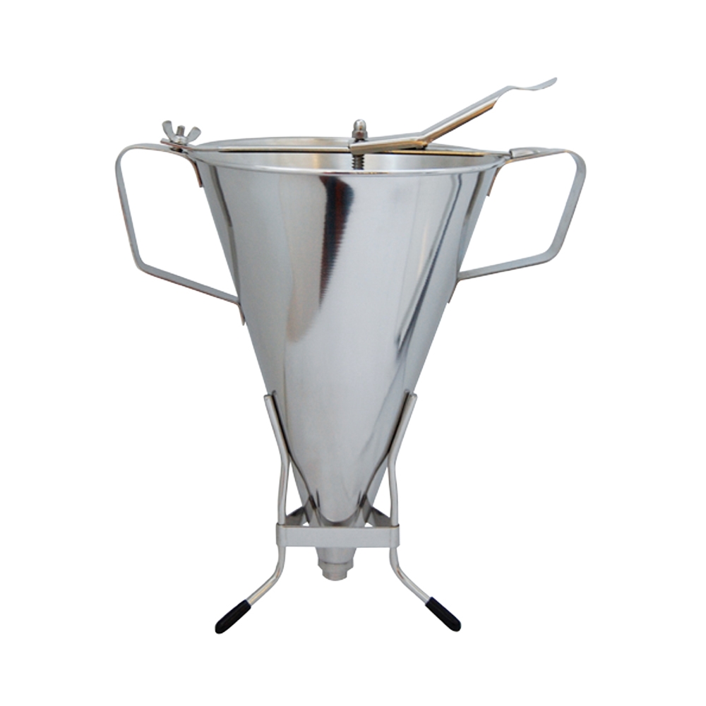 Inox. Livré avec support inox anti-dérapant. Buse intégrée 15 mm + 2 buses à visser 5 & 10 mm. Contenance 3.3 l. Diamètre de la buse : 15 mm. Dimensions : diamètre 20 cm. Hauteur 38 cm. l 30 cm. L 3.3 cm. Poids 0.87 kg. Convient au lave vaisselle. Deux anses. Entonnoir de forme conique. Mécanisme intérieur totalement démontable à l'aide d'une vis papillon. Convient au bain-marie.