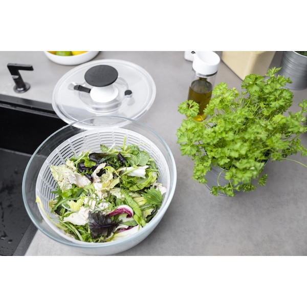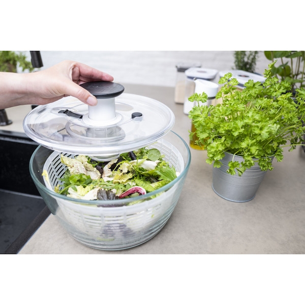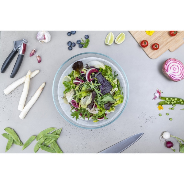 Le récipient en verre, outre qu'il permet un essorage parfaitement sain, devient un élégant saladier en verre qui fera bonne figure sur votre table.