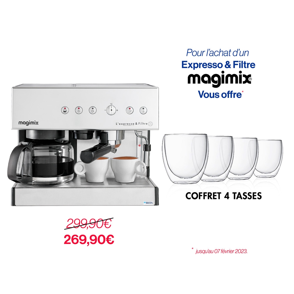 La machine à café MAGIMIX Expresso combiné Automatic se compose d'une partie expresso et d'une partie filtre. Elle offre un grand confort d'utilisation avec son contrôle de la température et son programme de détartrage. Pratique, elle possède un réservoir amovible (1.4 L.) et une fonction eau chaude/vapeur pour infusions ou cappuccino. Pour café moulu ou dosettes. Filtration Brita.