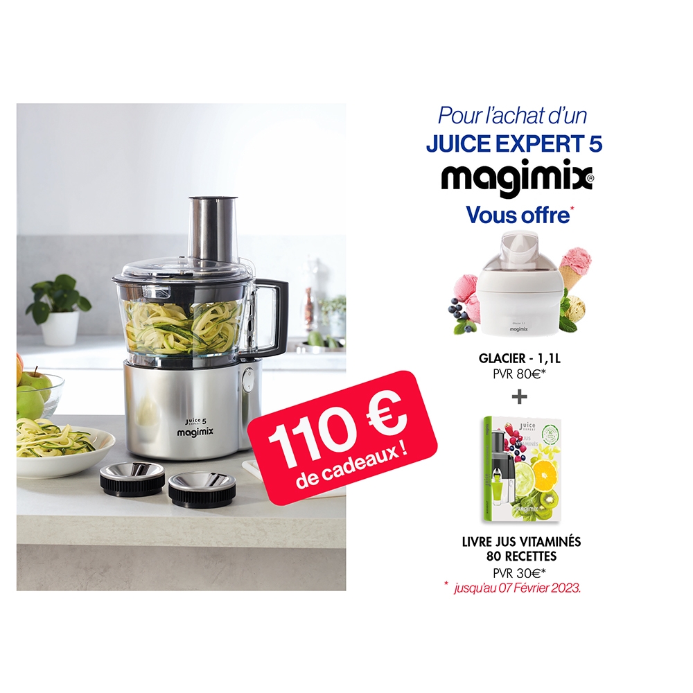 De format toujours compact, il est toujours très simple à nettoyer (les éléments passent au lave-vaisselle) et très performant en terme de préparation de jus. Le Jus Expert 5 est fabriqué en France, garanti 3 ans et son moteur jouit d'une garantie de 30 ans.