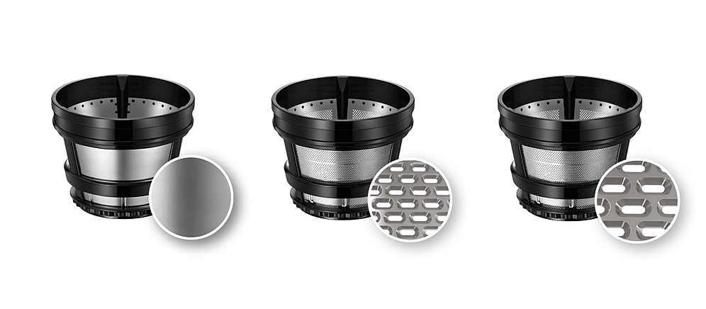 - 3 tamis inox : grands trous (jus pulpé et smoothies), petits trous (jus sans pulpe et boissons végétales) sans trous pour les sorbets.