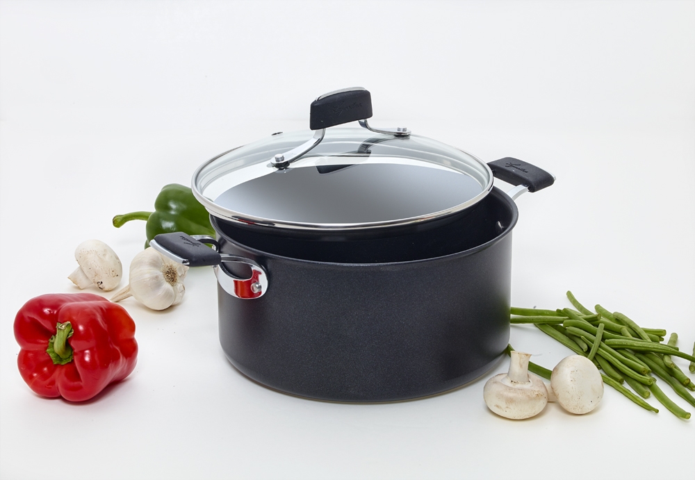Revêtement anti-adhésif haute qualité. Pas de PFOA, ni plomb, ni cadmium.. Fond Lagoseal anti-déformation épaisseur 5,5 mm. Anses rivetées avec revêtement silicone isolant effet "soft touch". Tous feux et induction. Fabriqué en France. Livrée avec couvercle verre.
