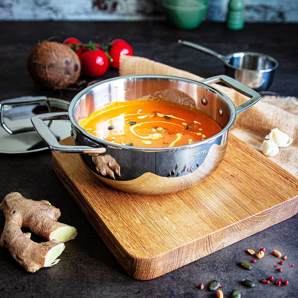 Cristel premier fabricant Français d'articles culinaires inox haut de gamme présente aujoud'hui sa nouvelle collection " CASTEL'PRO " pour la gastronomie professionnelle. Réalisées en acier inoxydable 18/10 intégrant 5 couches inox et aluminium, les faitouts "Castel'pro"distribuent la chaleur de façon homogène sur toute la surface de l'ustensile. Dotés d'anses rivetés en fonte d'inox aérée pour une utilisation intensive, d'un bord verseur fermé garantissant un risque d'oxydation réduit et une hygiène parfaite, ils sont compatibles tous feux et passent au lave-vaisselle. Leur forme arrondie facilite les mélanges et la montée des sauces.