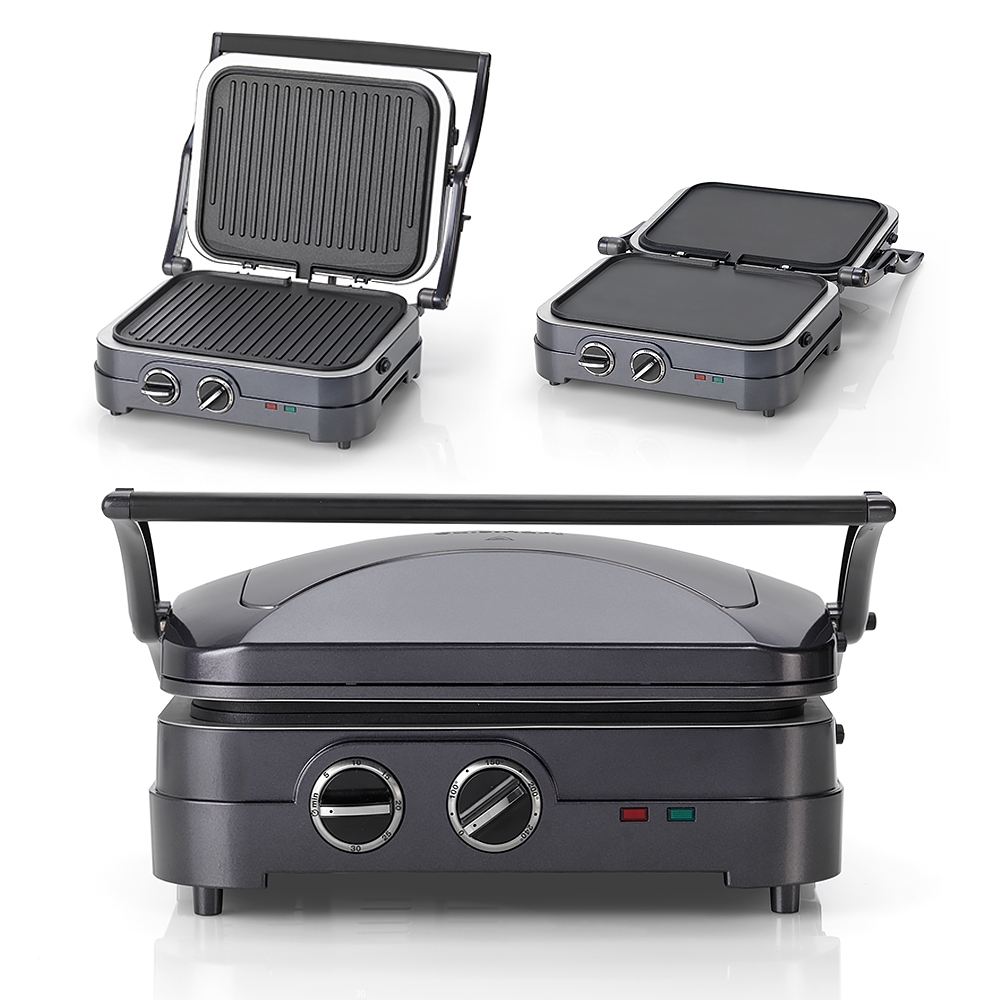 - Peut être utilisé comme grill double face ou ouvert à plat pour de plus grandes quantités.