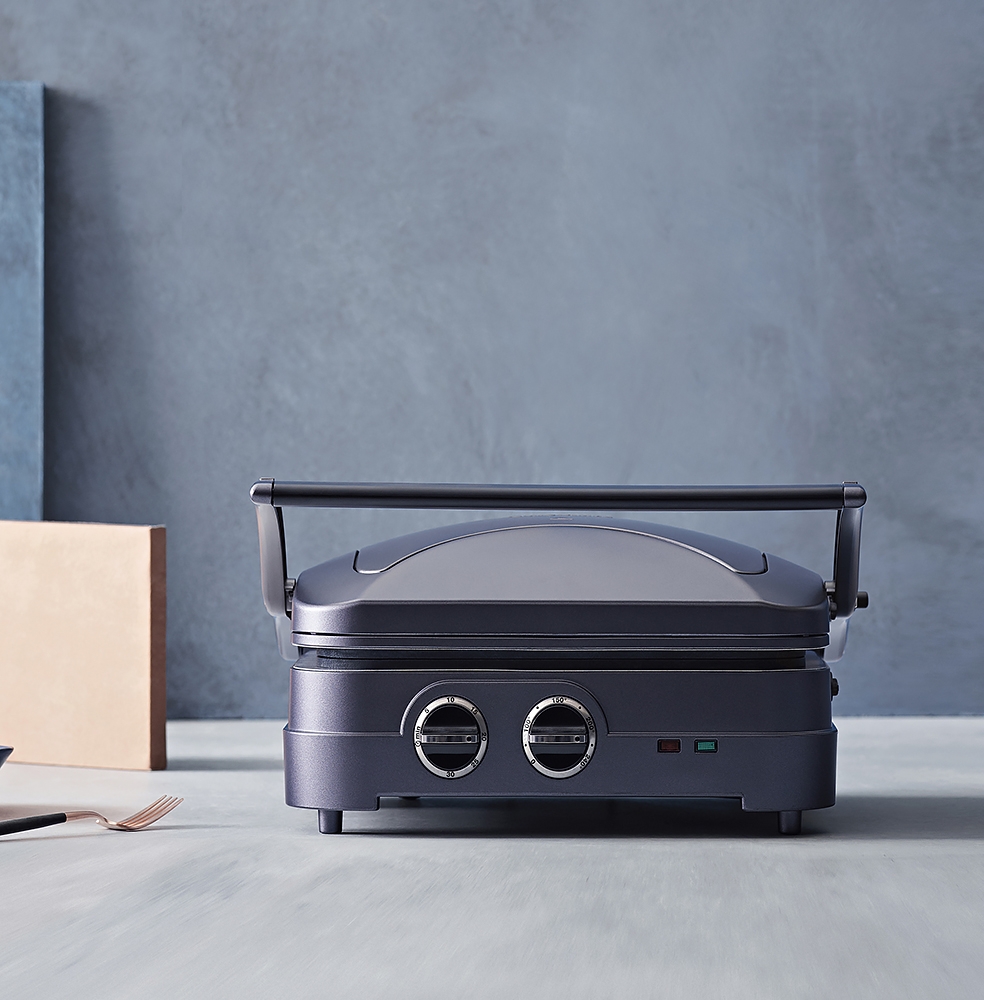Lors d'une utilisation fermée, les vharnières flottantes permettent à la partie supérieure d'appuyer délicatement sur l'ingrédient sans l'écraser. En utilisation ouverte, pour des aliments plus fragiles, vous disposez d'une surface de cuisson doublée. Un minuteur permet de maîtriser le temps de cuisson.