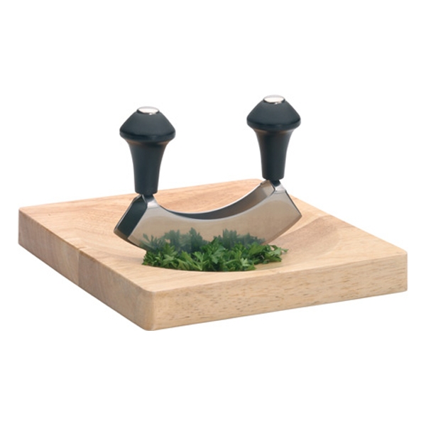 Double lame courbe inox 14 cm. Poignées ergonomiques. Va au lave vaisselle. Planche bois hêtre creusée 20 x 20 x 2 cm. Lavage à la main.