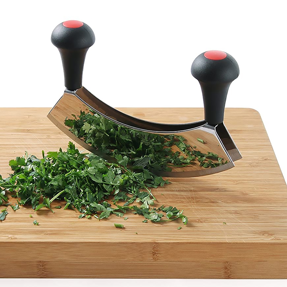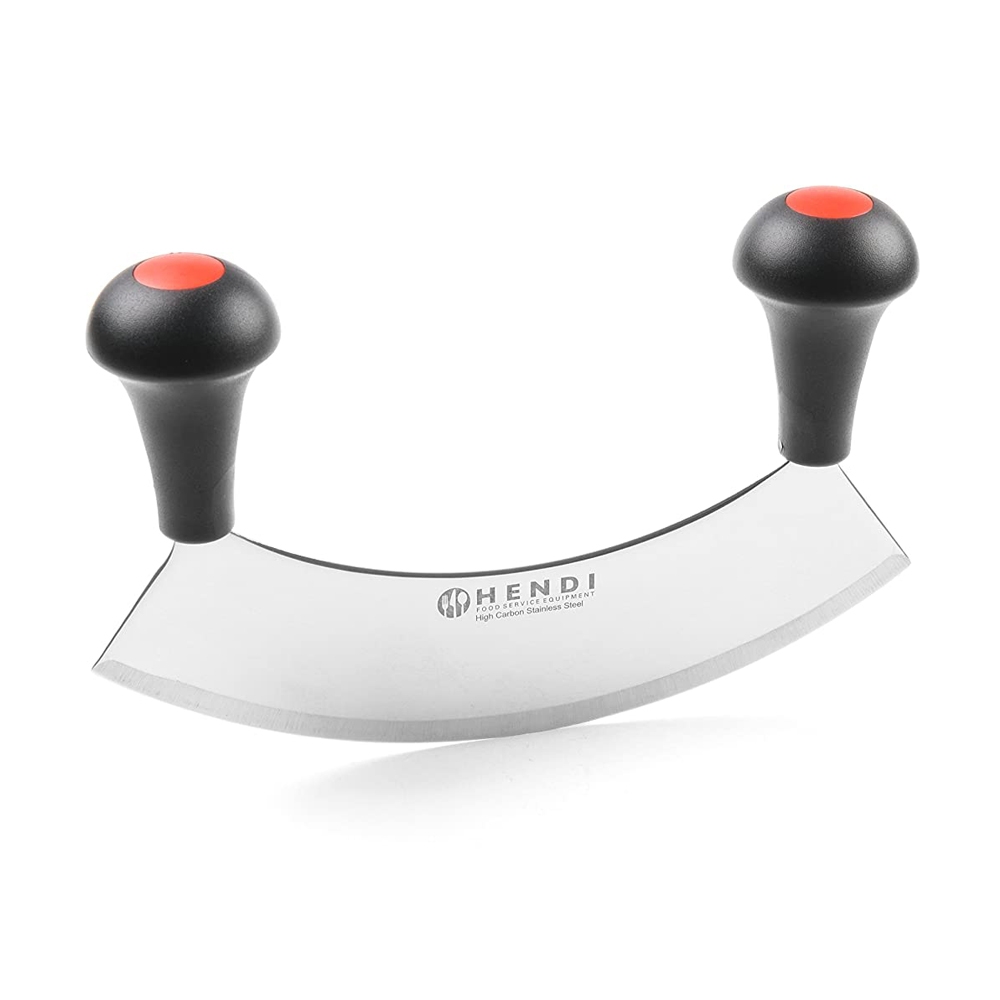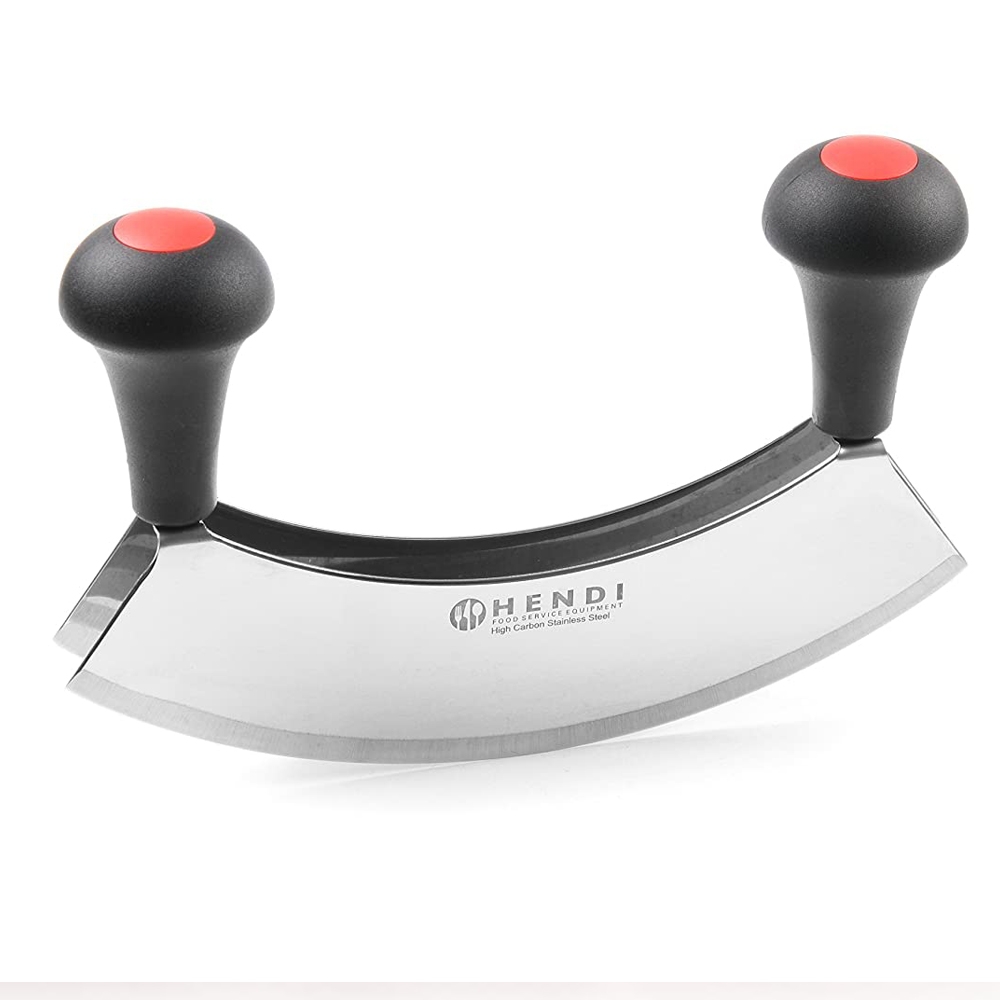 Le Hachoir Demi-lune Hendi est particulièrement efficace pour hacher les herbes. Il est réalisé en acier inoxydable avec manches en polypropylène. Il est disponible avec 1 ou 2 lame de 230 mm de longueur et est compatible lave-vaisselle.