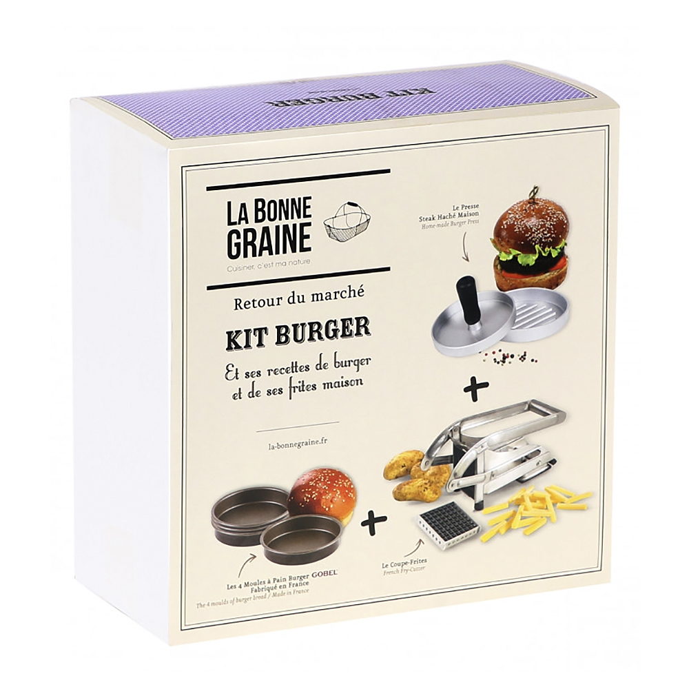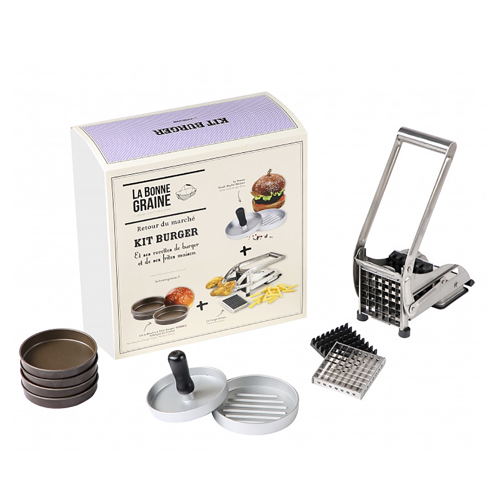 Idéal pour toute la famille et les experts en cuisine, le Kit Burger Louis Tellier permet la préparation de délicieux burger. Il se compose d'un coupe-frites, d'une presse steak haché, de 4 moules à pain et d'un livret de recettes.