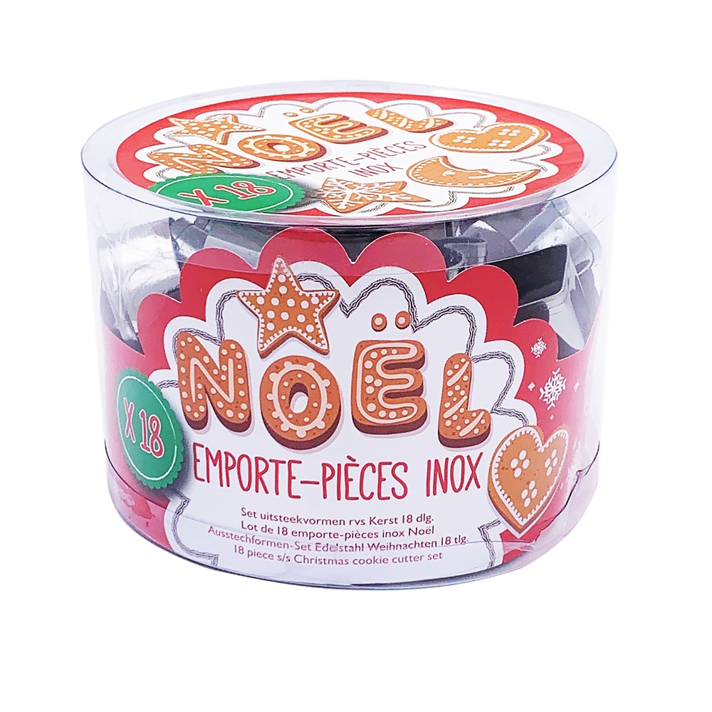 18 emporte-pièces pour réaliser des biscuits de Noël de différentes tailles. Différentes formes rappelant le thème de Noël sont proposées : étoile, animaux, sapin etc...