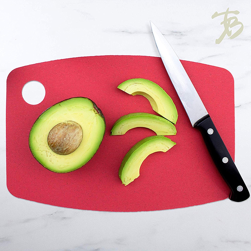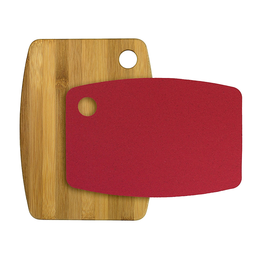 Lot composé d'une planche à découper en bambou et d'une planche à découper souple en fibres de bambou. Peu encombrantes, elles se rangent facilement et peuvent s'accrocher grâce à un orifice prévu à cet effet. La planche en bambou, robuste et légère parfaite pour préparer et servir toutes les préparations se nettoie à la main alors que celle en fibres de bambou protège la lame de vos couteaux, assure une découpe douce et fluide et passe au lave-vaisselle. Une face antidérapante (planche en fibres) procure un excellent maintien de la planche pendant la découpe.
