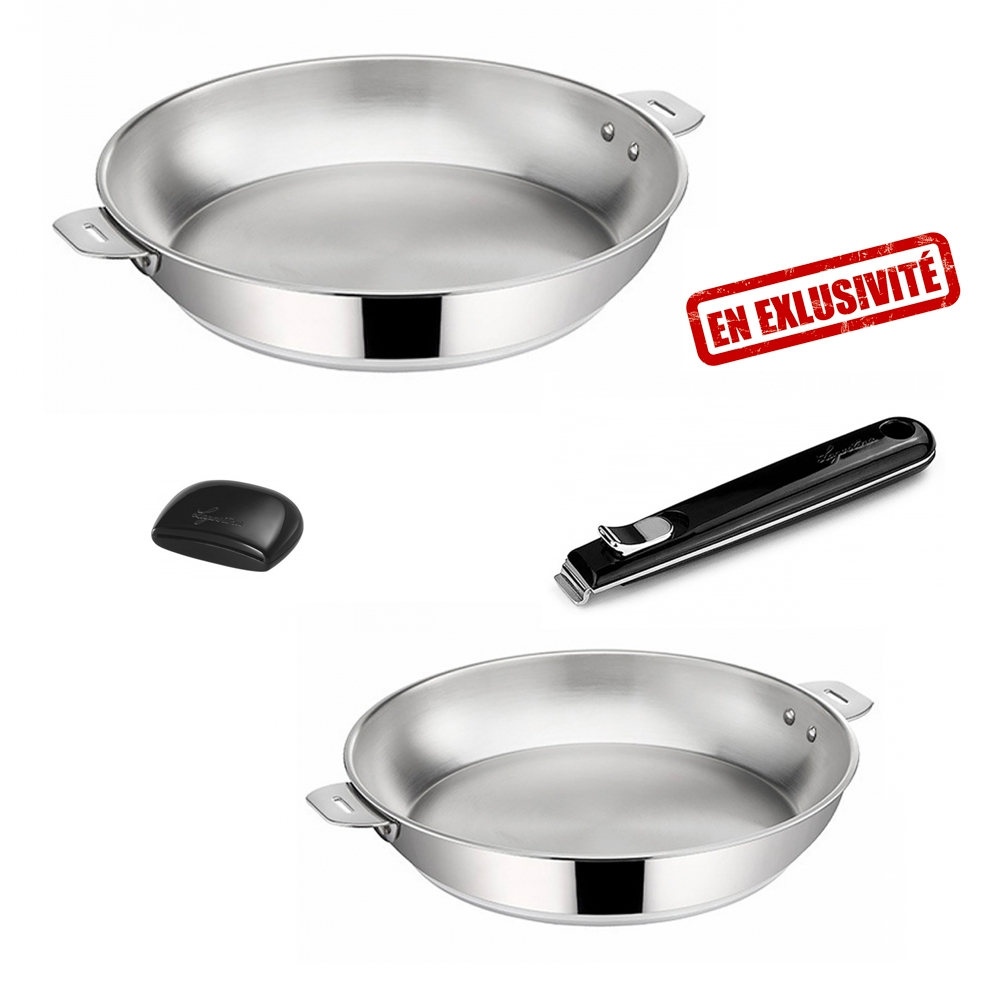 Nous vous proposons en exclusivité ce lot de 2 poêles inox da la gamme amovible Salvaspazio Lagostina. Le set est proposé dans des tailles standards 24 et 26 cm pour tout cuisiner. Elles sont accompagnées d'une poignée et d'une anse amovibles.