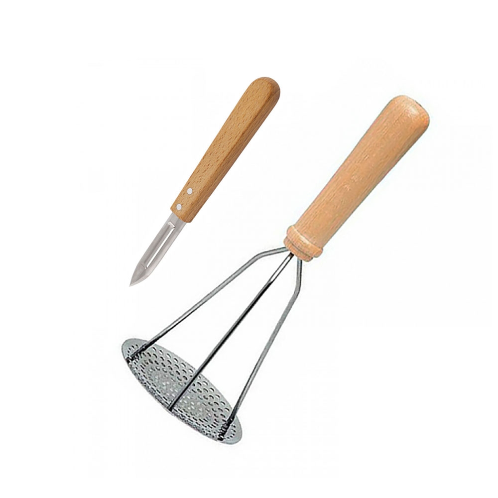 Le Lot Presse Purée & Eplucheur Roger Orfevre est fabriqué à partir de matériaux sains : bois de hêtre et acier inoxydable. Il s'agit de produits fabriqués en France à Thiers au coeur de la région Auvergne-Rhône Alpes. Le manche ergonomique du presse purée permet une bonne prise en main et sa grille en acier écrase en quelques pressions seulement. L'éplucheur est doté d'une lame double sens particulièrement affûtée.