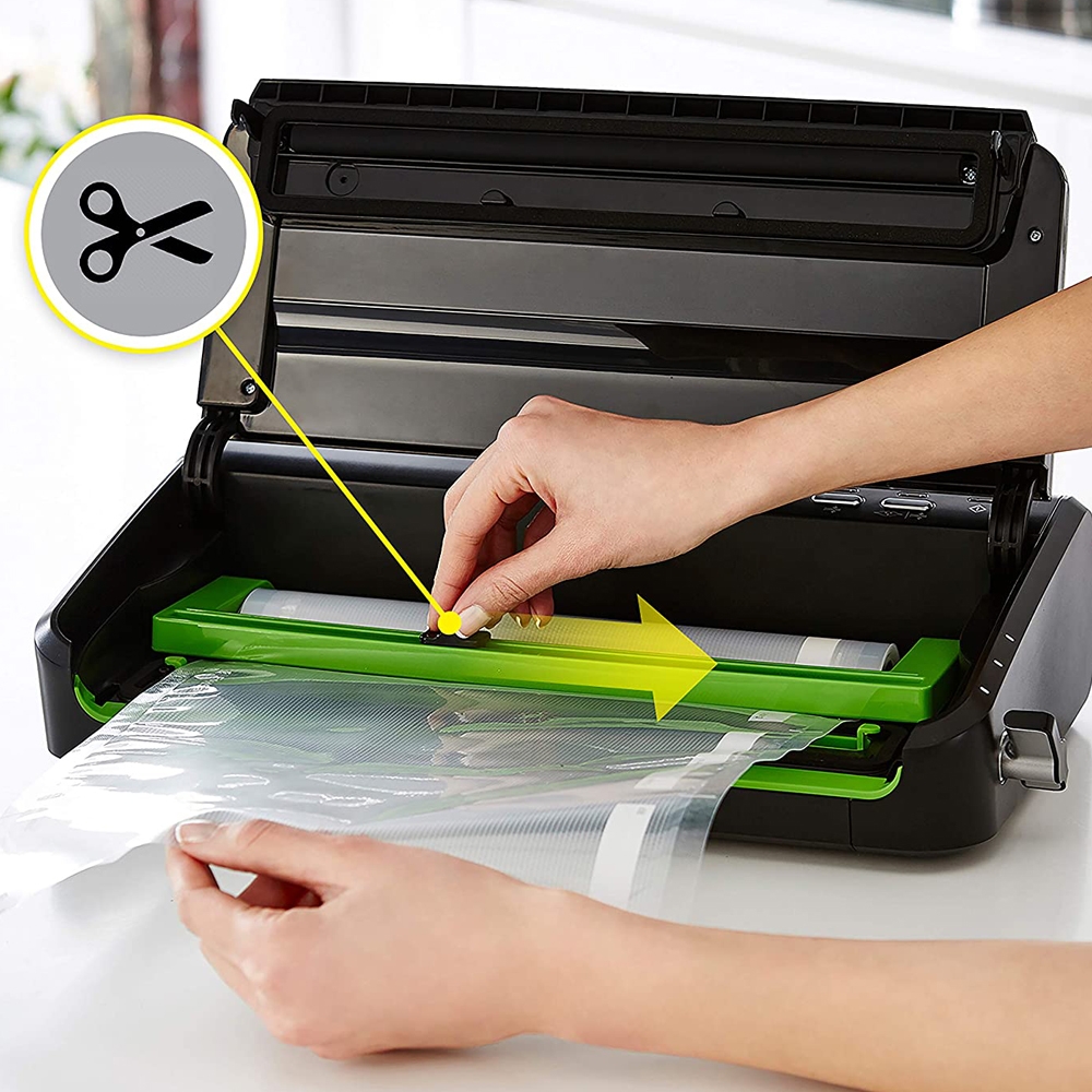 - Mode scellage indépendant pour emballer les aliments de toute taille en créant vos propre sacs à partir de rouleaux.