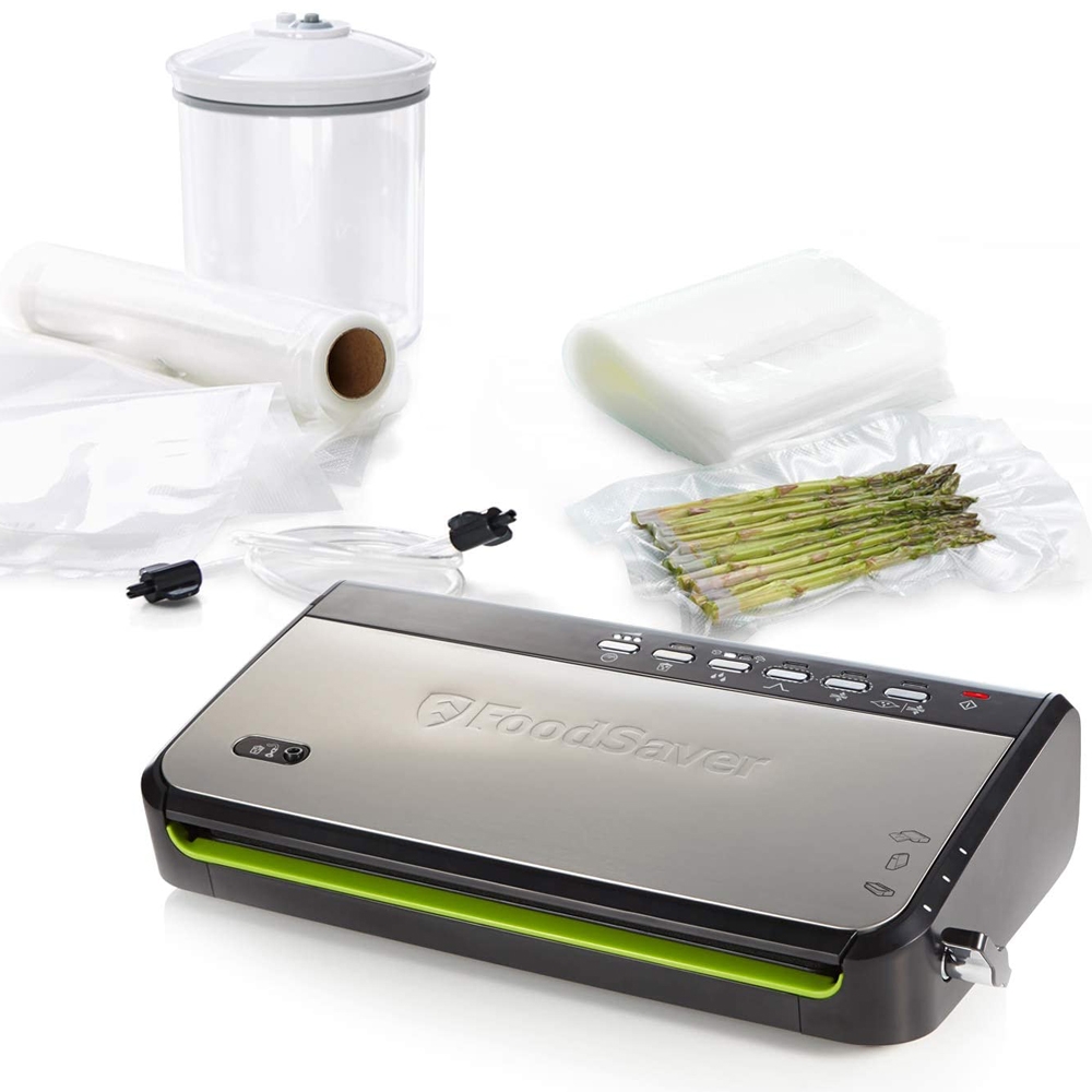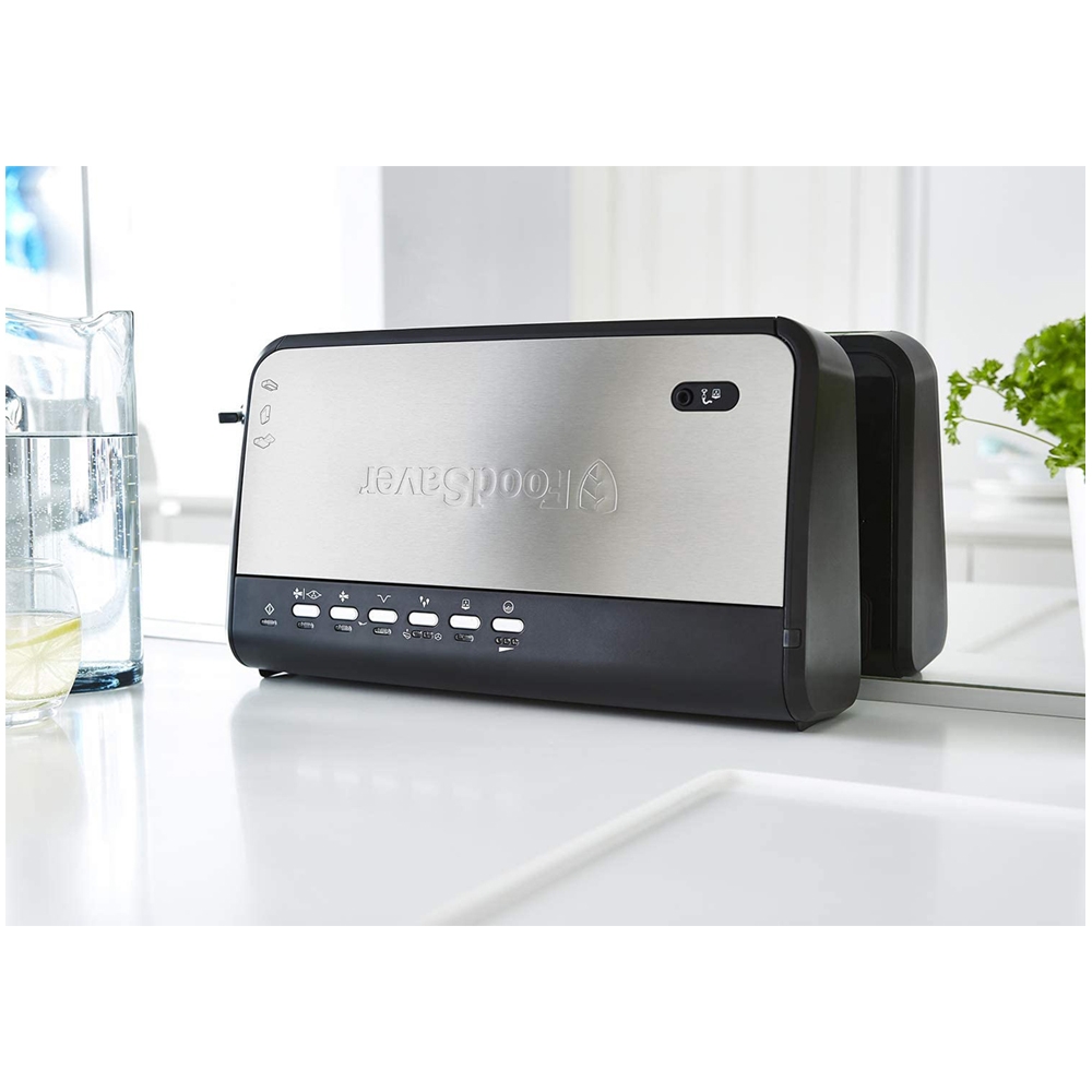 La Machine à Emballer Sous Vide FFS005X Food Saver est réalisé en acier inoxydable et conserve la fraîcheur des aliments jusqu'à 5 fois plus longtemps. Sa fonction de mise sous vide et soudure automatique vous permet d'emballer sous vide les aliments dans des sacs et récipients. Equipée d'un compartiment de rangement pour rouleau avec cutter intégré, de 2 niveaux de soudure et de 4 vitesses d'aspiration dont 1 niveau manuel, cette machine de mise sous vide vous assure un contrôle absolu. Goût et fraîcheur vont de pair en cuisine. En extrayant l'air, le système de mise sous vide Food Saver vous permettent de conserver plus longtemps, de diminuer le gaspillage et donc de diminuer le budget alimentation. Grâce à ses lignes compactes et épurées, la Machine FFS005X Food Saver se range à la verticale pour un gain de place et s'intègre parfaitement dans toutes les cuisines. La majorité des sacs et rouleaux Food Saver sont compatibles réfrigérateurs, congélateurs, micro-ondes et bain-marie. Ils comprtent 5 épaisseurs et sont spécialement conçus pour permettre une extraction optimale de l'air. Résultat : plus de "poches" d'air autour des aliments, souvent responsables de leur détérioration et dfes brûlures de congélation. Tous les sacs et rouleaux sont garantis sans BPA.