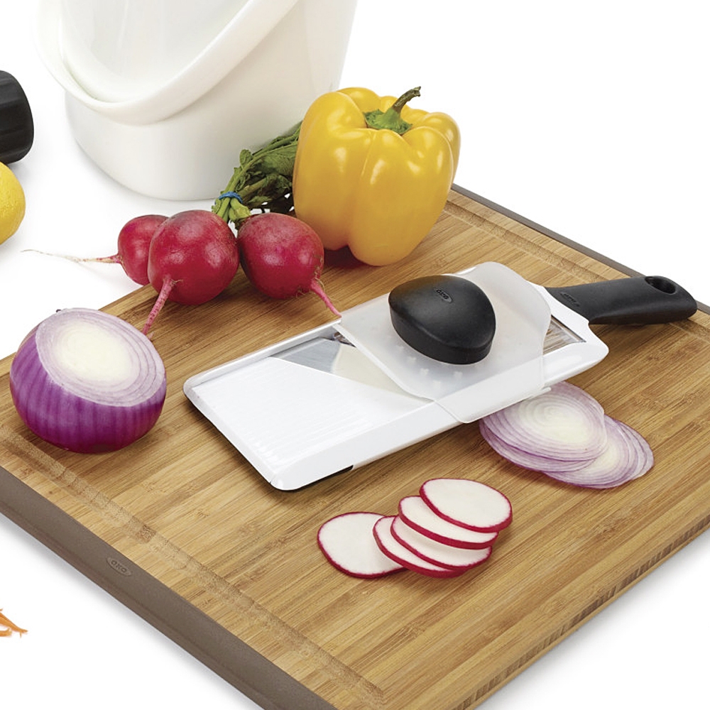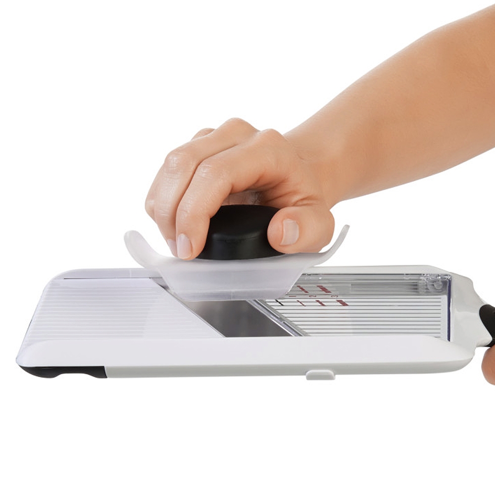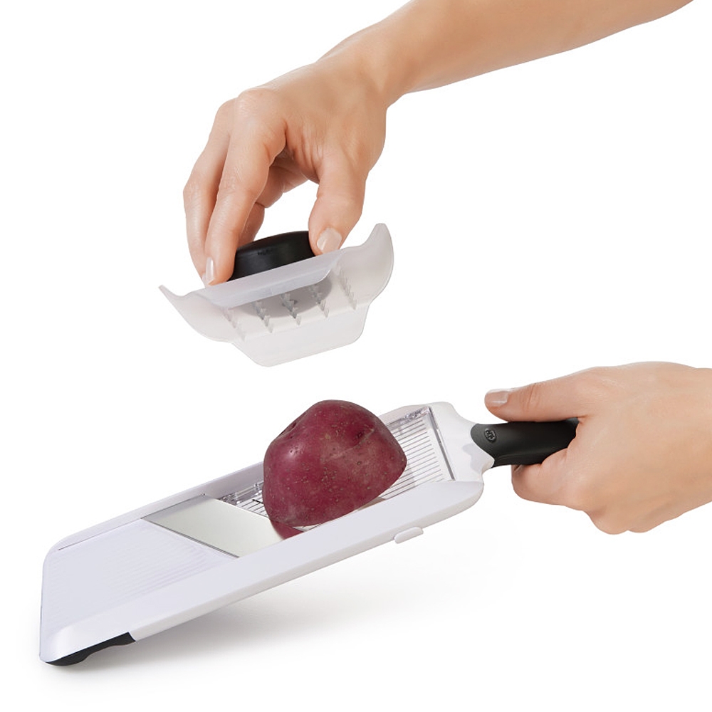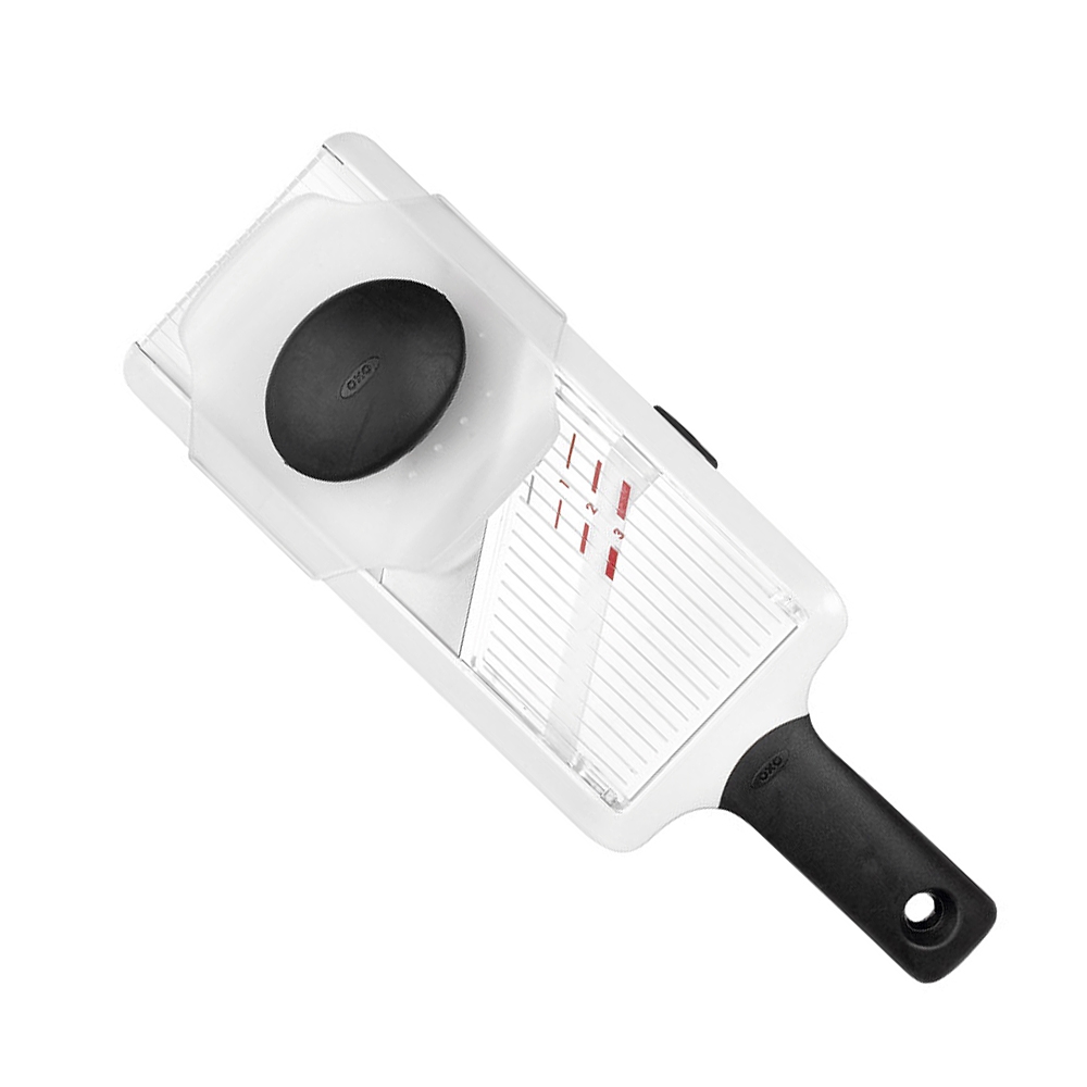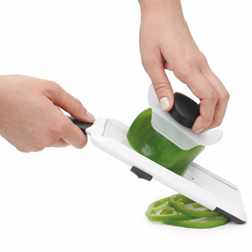 Grâce à cette petite trancheuse oxo Good Grips vous pouvez trancher au-dessus d'une assiette, d'un plat ou tout autre récipient. Il s'accrocher également sur le rebord d'un bol. Sa fenêtre transparente vous permet de voir les tranches coupées au fur et à mesure.
