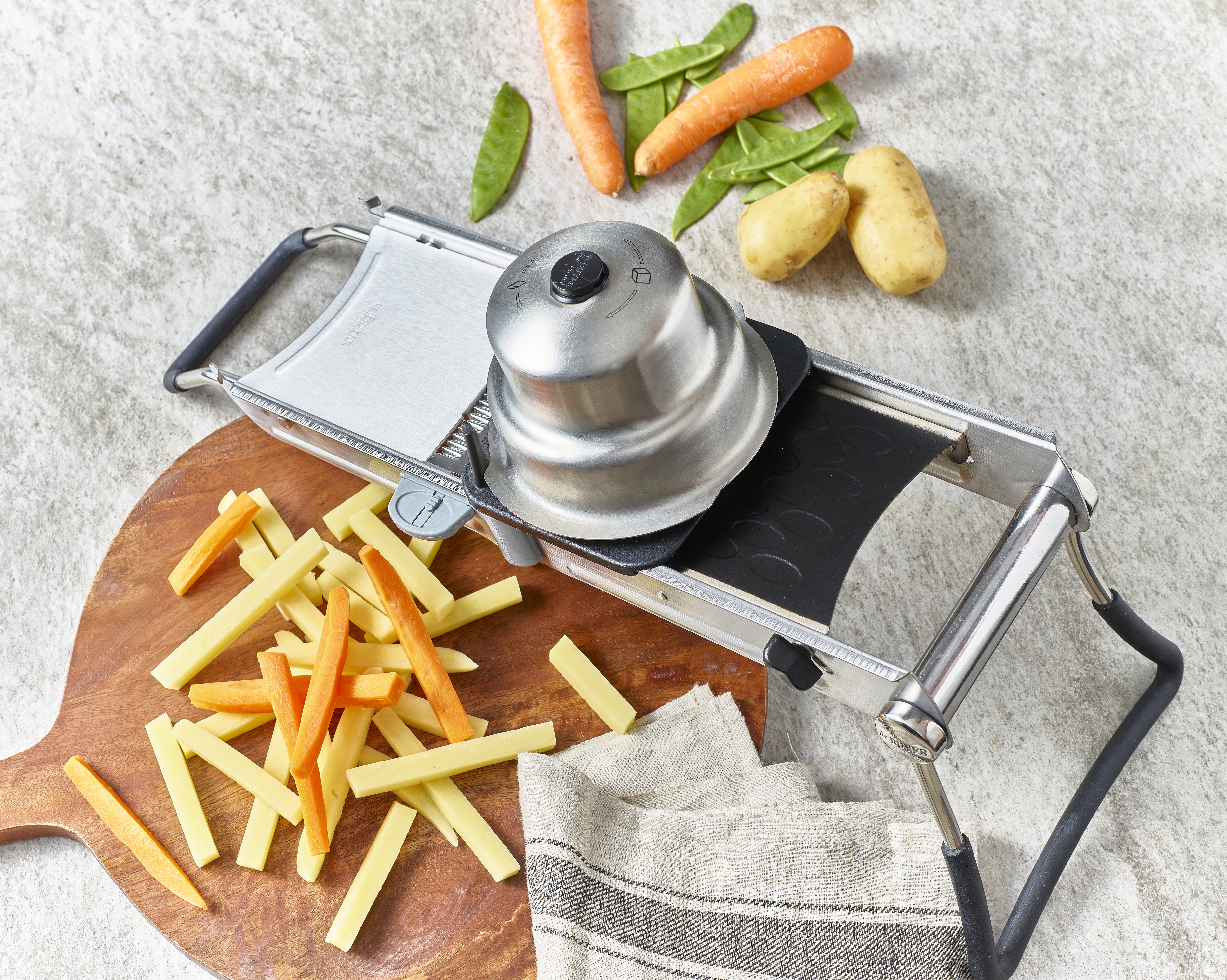 Acier inoxydable et polymère composite. Aspect inox brossé satiné. Pieds repliables revêtus silicone. Livrée avec 1 double lame révolution et ondulée, 6 peignes Julienne : 2/3/4/5/7/10 mm+ 1 poussoir long pour couper les légumes en grande taille et 1 chariot et son poussoir protecteur en inox. Support de lames juliennes à encastrer sous le châssis. Réglage de l'épaisseur de coupe jusqu'à 10 mm. Dimensions : L 50 x l 18.5 x h 18 cm. Va au lave vaisselle. Garantie 2 ans. Fabriquée en France.
